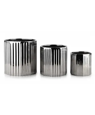 Komplet doniczek ceramicznych w kolorze srebrnym, zdobiona pionowymi żłobieniami.