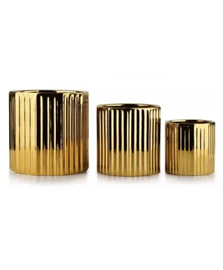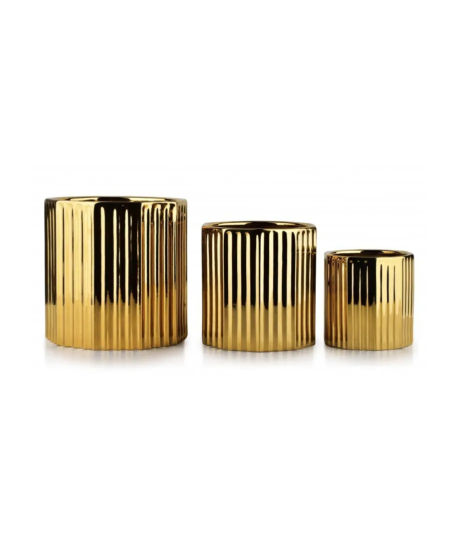 Komplet doniczek ceramicznych w kolorze złotym, zdobiona pionowymi żłobieniami.