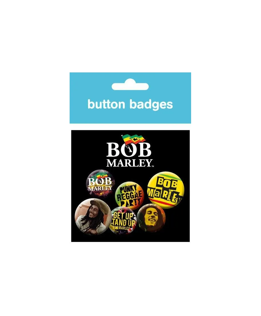 Zestaw sześciu kolorowych przypinek Bob Marley One Love dla dzieciaków i młodzieży.