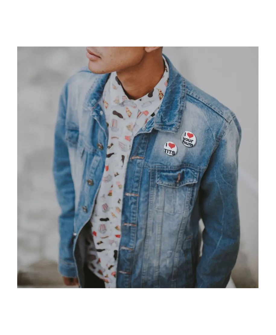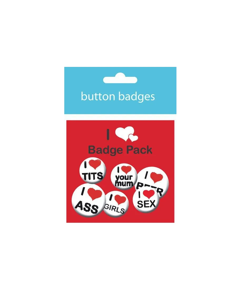 Zestaw sześciu kolorowych przypinek I Love Man's Pack dla dzieciaków i młodzieży.