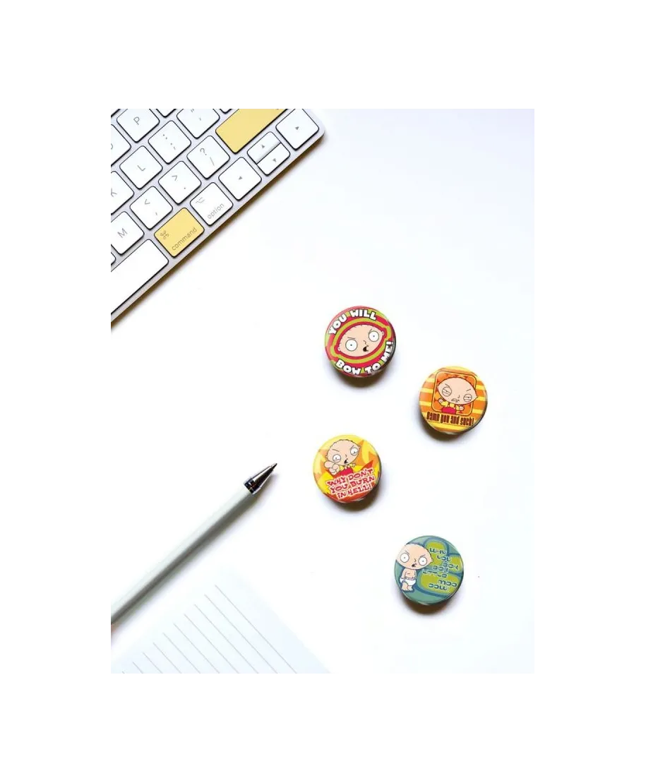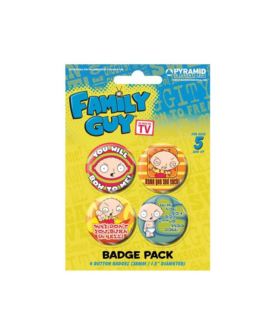 Zestaw czterech kolorowych przypinek Family Guy (Stewie) dla dzieciaków i młodzieży.