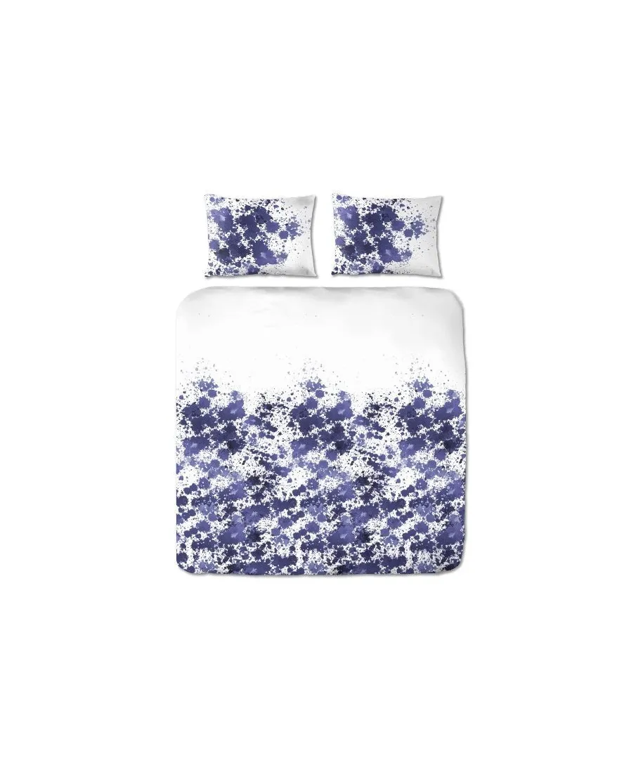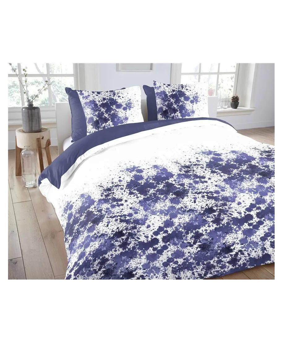 Modna, utrzymana w biało-granatowej tonacji kolorystyka stanowi tło dla przyciągającego uwagę wzoru imitującego artystyczny nieład złożony z różnej wielkości kleksów. Poduszki są zadrukowane z obu stron, jedna strona poszwy na kołdrę w jednolitym ciemnoniebieskim kolorze.