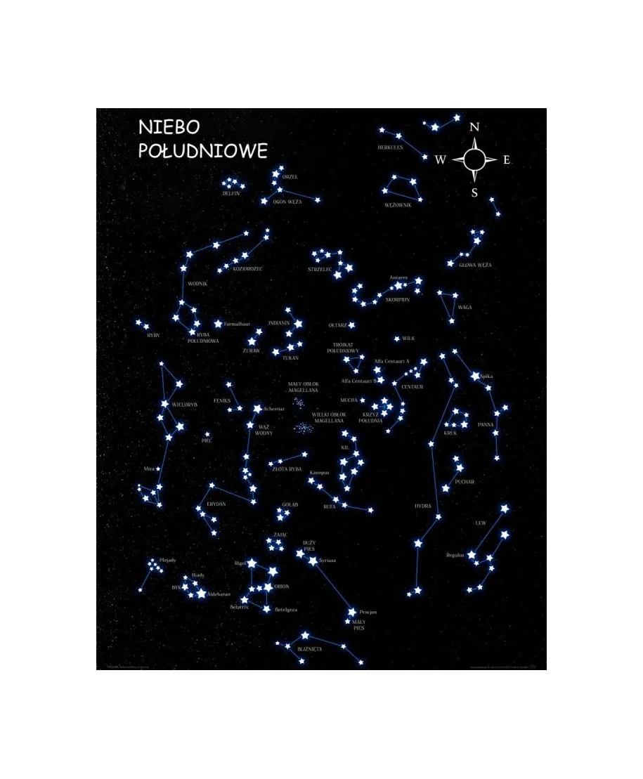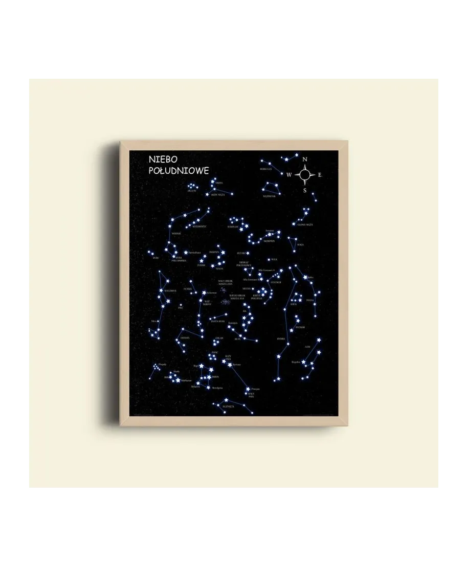 Plakat z mapą na ścianę, zatytułowany Niebo Południowe czarne Ciekawy i oryginalny plakat na ścianę. Wyprodukowany na papierze o wysokiej gramaturze w cyfrowej jakości. Plakat wykonany przez polskiego producenta. Świetnie nadaje się do oprawienia w ramy lub antyramy. Specyfikacja papier satynowy 220g/m2 druk cyfrowy wymiary plakatu 40x50 cm