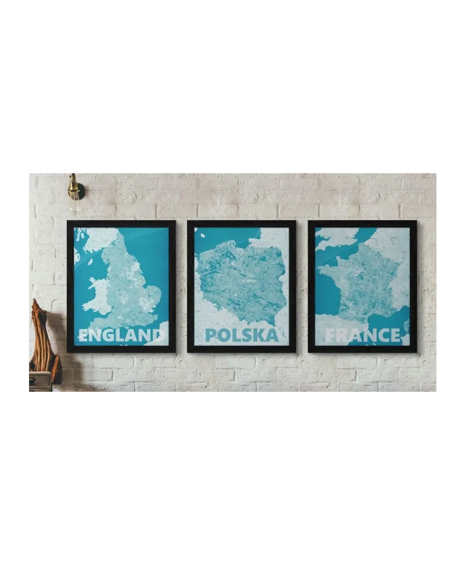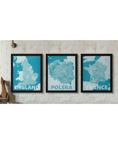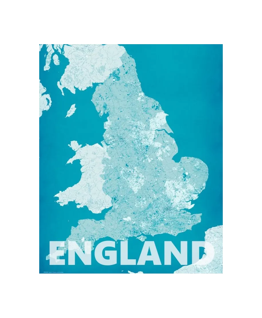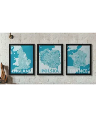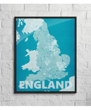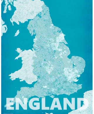 Plakat z mapą na ścianę, zatytułowany England, modern blue Ciekawa i oryginalna mapa na ścianę. Wyprodukowany na papierze o wysokiej gramaturze w cyfrowej jakości. Mapy wykonane przez polskiego producenta. Świetnie nadają się do oprawienia w ramy lub antyramy. Specyfikacja papier satynowy 220g/m2 druk cyfrowy wymiary map 40x50 cm
