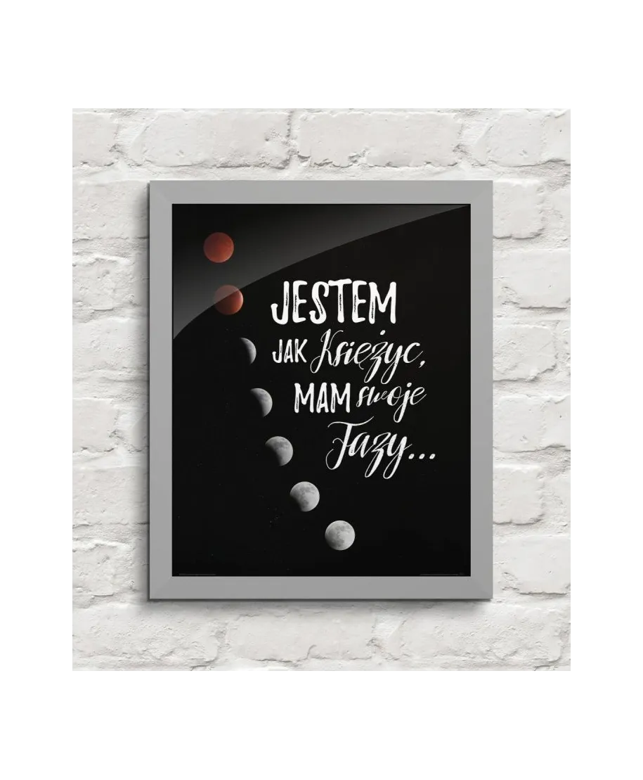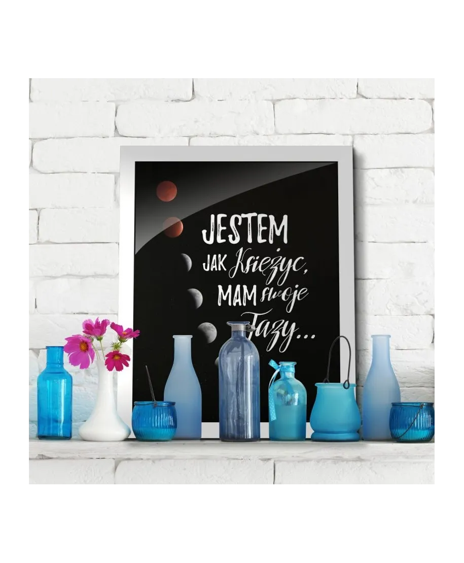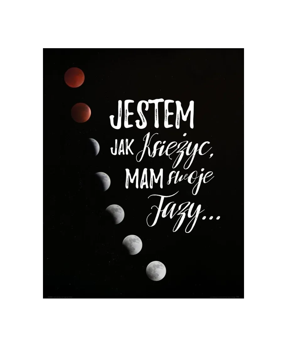 Plakat na ścianę, zatytułowany Jestem jak księżyc mam swoje fazy Ciekawy i oryginalny plakat na ścianę. Wyprodukowany na papierze o wysokiej gramaturze w cyfrowej jakości. Plakat wykonany przez polskiego producenta. Świetnie nadaje się do oprawienia w ramy lub antyramy. Specyfikacja papier satynowy 220g/m2 druk cyfrowy wymiary plakatu 40x50 cm