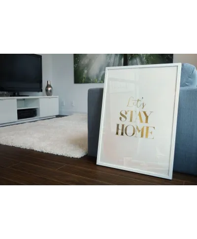 Plakat na ścianę, zatytułowany Let's stay home Ciekawy i oryginalny plakat na ścianę. Wyprodukowany na papierze o wysokiej gramaturze w cyfrowej jakości. Plakat wykonany przez polskiego producenta. Świetnie nadaje się do oprawienia w ramy lub antyramy. Specyfikacja papier satynowy 220g/m2 druk cyfrowy wymiary plakatu 40x50 cm