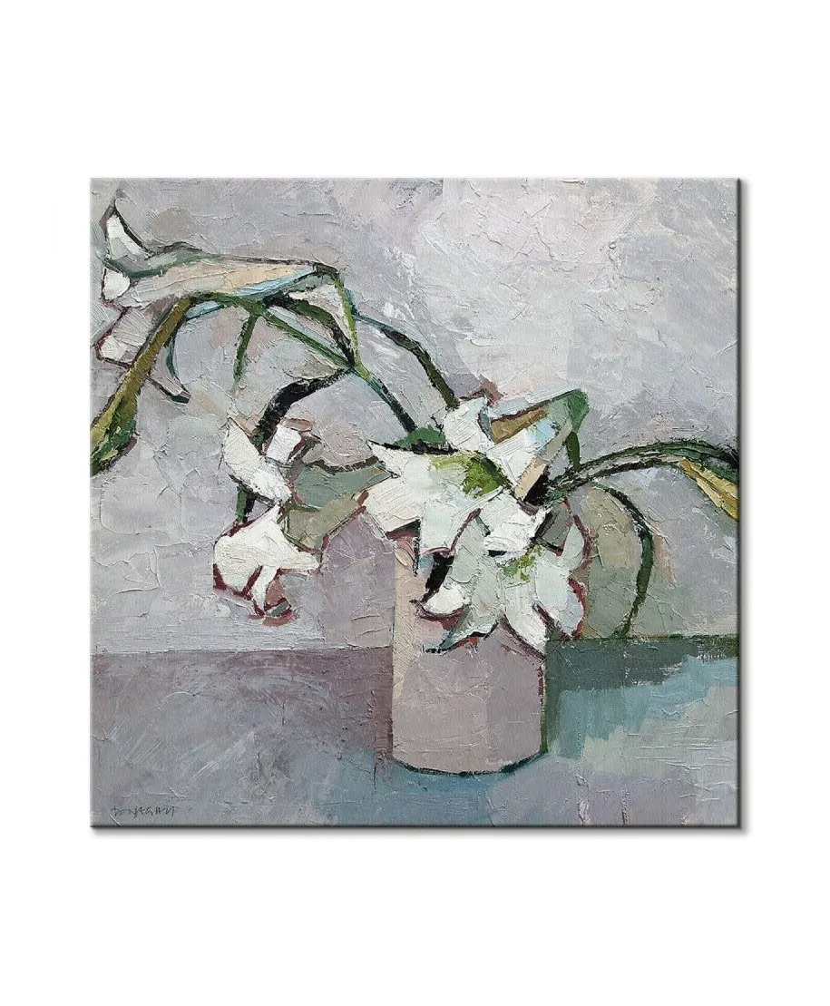 White Lillies obraz na płótnie naciągnięty na sosnowe krosna. Gotowy do zawieszenia na ścianę. Wykonany z najwyższą dbałością o detale. Obraz jest ostry a barwy nasycone. Ten egzemplarz posiada zadrukowane boki, nie trzeba go dodatkowo oprawiać. Płótno bawełniane na który został naniesiony obraz jest bardzo mocne i posiada ciekawą fakturę. Blejtrama wykonana jest natomiast z grubego drzewa sosnowego. Jest solidna, jej szerokość to 3,5 cm a grubość 2 cm. Kupując ten produkt masz pewność, że kupujesz z legalnego źródła i wspierasz artystów. Obraz jest oryginalny i posiada licencję. Lubisz wyróżniać się ciekawymi, ekskluzywnymi dekoracjami na ścianę ? Ten obraz jest idealny dla Ciebie. Nikt nie przejdzie obojętnie obok niego, jest po prostu piękny. Dane techniczne Płótno bawełniane 300g/m2 Sosnowe krosna o grubości 2 cm i szerokości 3,5 cm Obraz zadrukowany cyfrowo Wymiary obrazu 40x40 cm