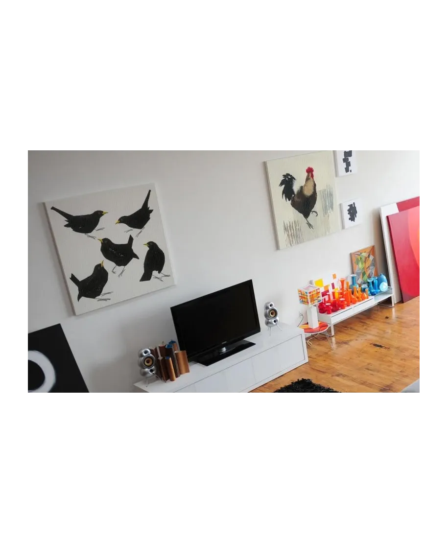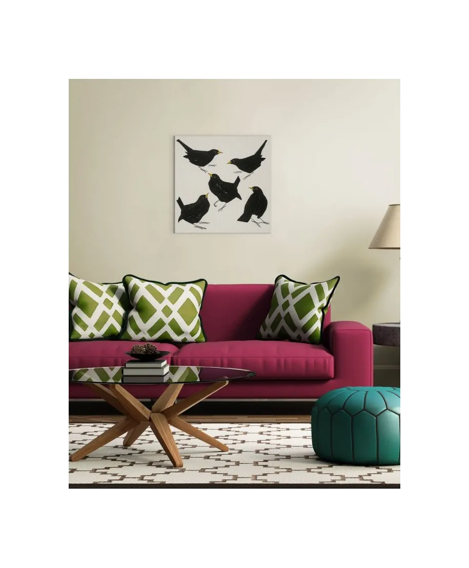 Blackbirds - obraz na płótnie Naciągnięty na sosnowe krosna. Gotowy do zawieszenia na ścianę. Wykonany z najwyższą dbałością o detale. Obraz jest ostry a barwy nasycone. Ten egzemplarz posiada zadrukowane boki, nie trzeba go dodatkowo oprawiać. Płótno bawełniane na który został naniesiony obraz jest bardzo mocne i posiada ciekawą fakturę. Blejtrama wykonana jest natomiast z grubego drzewa sosnowego. Jest solidna, jej szerokość to 3,5 cm a grubość 2 cm. Kupując ten produkt masz pewność, że kupujesz z legalnego źródła i wspierasz artystów. Obraz jest oryginalny i posiada licencję. Lubisz wyróżniać się ciekawymi, ekskluzywnymi dekoracjami na ścianę? Ten obraz jest idealny dla Ciebie. Nikt nie przejdzie obojętnie obok niego, jest po prostu piękny. Dane techniczne Płótno bawełniane 300g/m2 Sosnowe krosna o grubości 2 cm i szerokości 3,5 cm Obraz zadrukowany cyfrowo Wymiary obrazu 60x60 cm