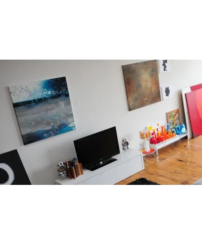 Ice Blue - obraz na płótnie Naciągnięty na sosnowe krosna. Gotowy do zawieszenia na ścianę. Wykonany z najwyższą dbałością o detale. Obraz jest ostry a barwy nasycone. Ten egzemplarz posiada zadrukowane boki, nie trzeba go dodatkowo oprawiać. Płótno bawełniane na który został naniesiony obraz jest bardzo mocne i posiada ciekawą fakturę. Blejtrama wykonana jest natomiast z grubego drzewa sosnowego. Jest solidna, jej szerokość to 3,5 cm a grubość 2 cm. Kupując ten produkt masz pewność, że kupujesz z legalnego źródła i wspierasz artystów. Obraz jest oryginalny i posiada licencję. Lubisz wyróżniać się ciekawymi, ekskluzywnymi dekoracjami na ścianę? Ten obraz jest idealny dla Ciebie. Nikt nie przejdzie obojętnie obok niego, jest po prostu piękny. Dane techniczne Płótno bawełniane 300g/m2 Sosnowe krosna o grubości 2 cm i szerokości 3,5 cm Obraz zadrukowany cyfrowo Wymiary obrazu 85x85 cm