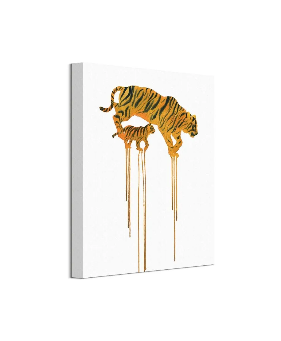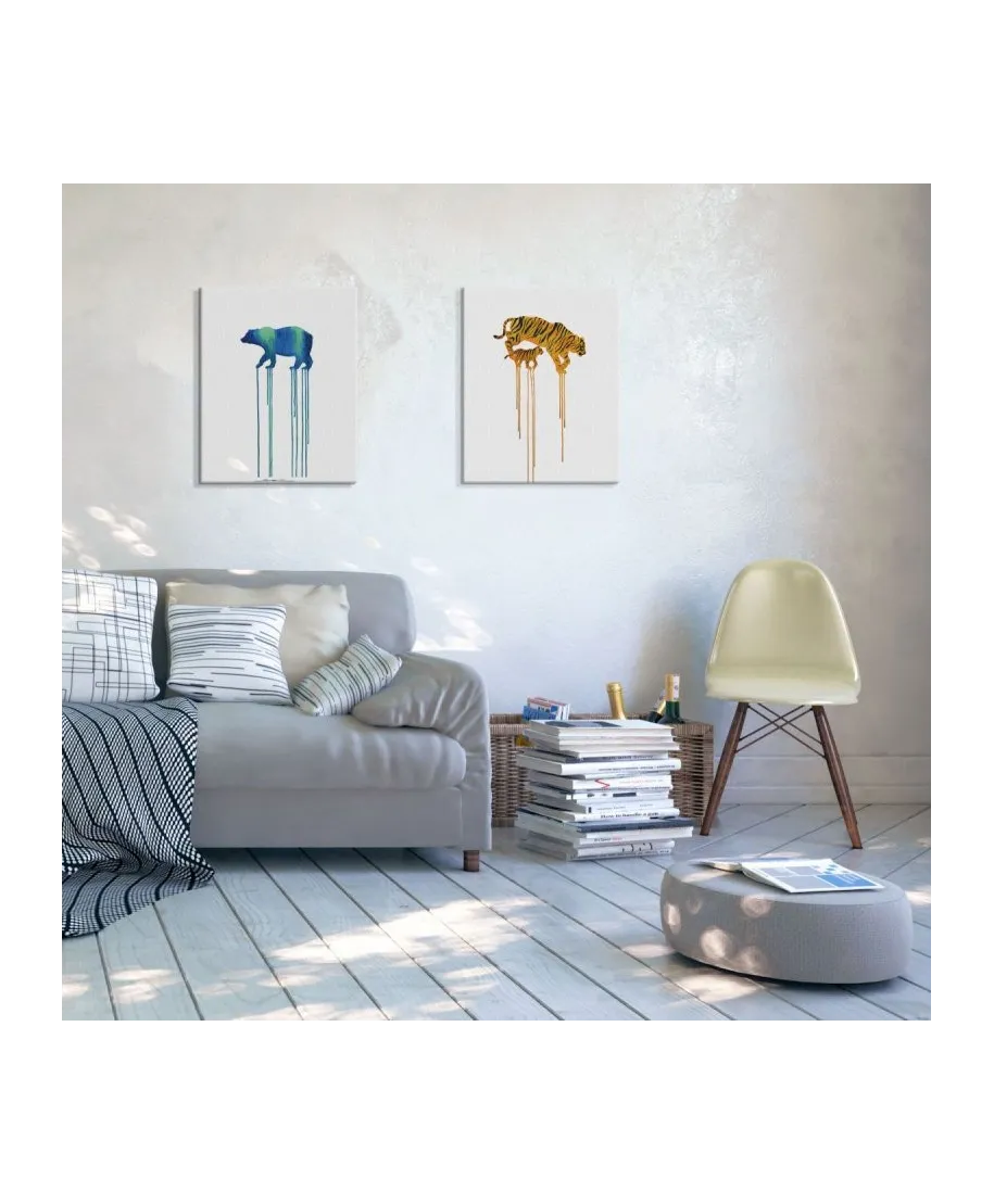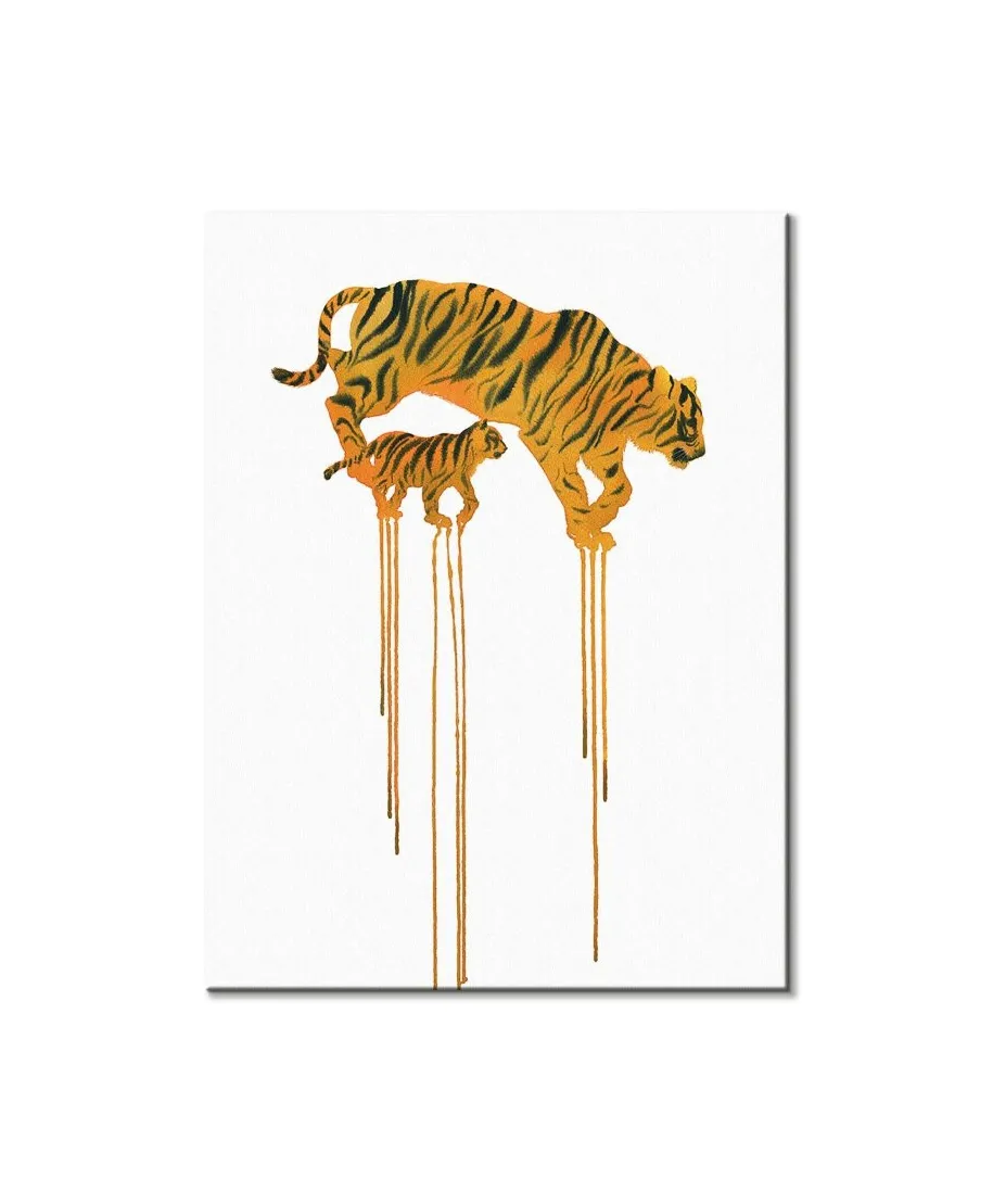 Tigers - obraz na płótnie Naciągnięty na sosnowe krosna. Gotowy do zawieszenia na ścianę. Wykonany z najwyższą dbałością o detale. Obraz jest ostry a barwy nasycone. Ten egzemplarz posiada zadrukowane boki, nie trzeba go dodatkowo oprawiać. Płótno bawełniane na który został naniesiony obraz jest bardzo mocne i posiada ciekawą fakturę. Blejtrama wykonana jest natomiast z grubego drzewa sosnowego. Jest solidna, jej szerokość to 3,5 cm a grubość 2 cm. Kupując ten produkt masz pewność, że kupujesz z legalnego źródła i wspierasz artystów. Obraz jest oryginalny i posiada licencję. Lubisz wyróżniać się ciekawymi, ekskluzywnymi dekoracjami na ścianę? Ten obraz jest idealny dla Ciebie. Nikt nie przejdzie obojętnie obok niego, jest po prostu piękny. Dane techniczne Płótno bawełniane 300g/m2 Sosnowe krosna o grubości 2 cm i szerokości 3,5 cm Obraz zadrukowany cyfrowo Wymiary obrazu 30x40 cm