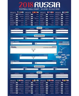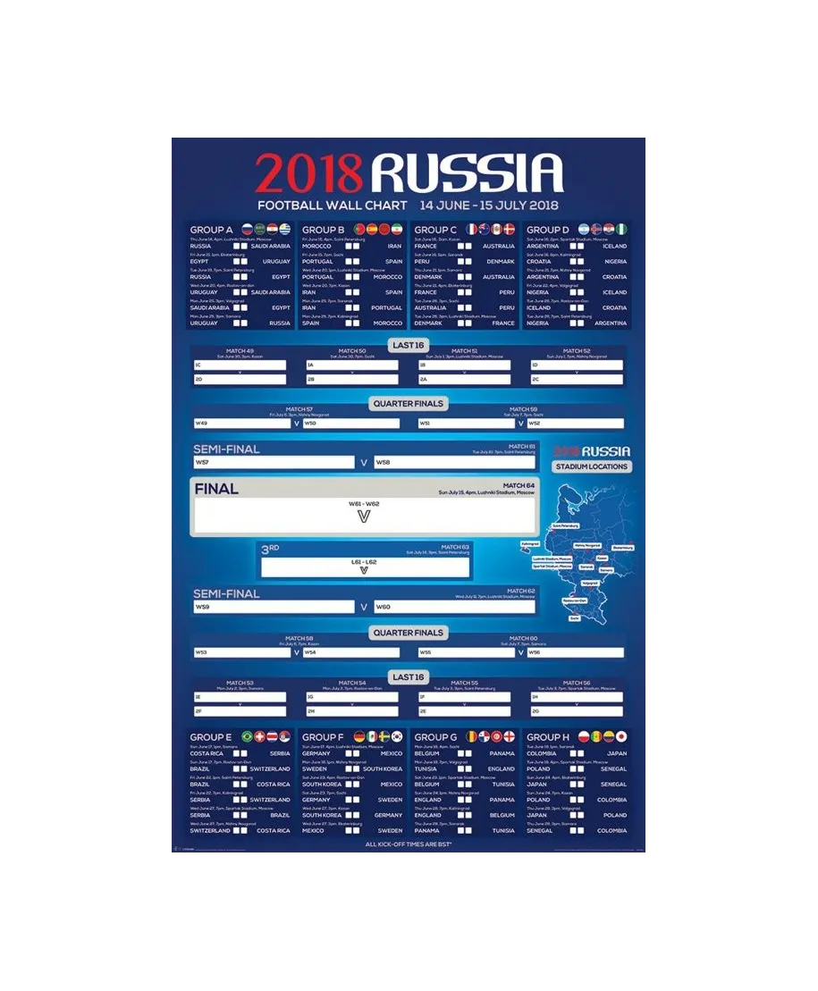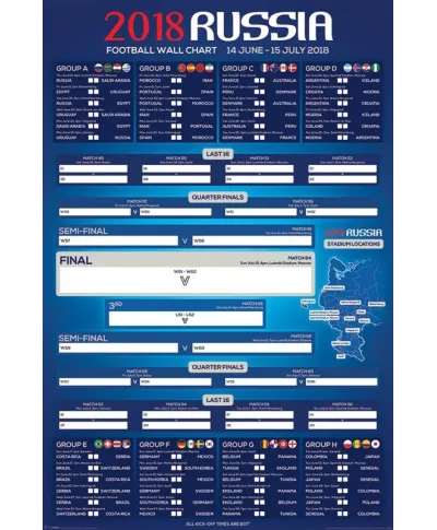 Tabela Mistrzostw Świata w Rosji 2018 - plakat z rozgrywkami Poster przedstawiający tabelę rozgrywek na Mistrzostwach Świata w piłce nożnej, które odbędą się w Rosji. Nasze plakaty wyróżniają się: Rewelacyjnąjakośćą, Wytrzymały papier, Oryginalnością i licencją producenta, Matowąpowierzchnią zapobiegającą odbijaniu się światła. Szczegóły techniczne: Gruby i mocny papier 150g/m2.. Wymiary: 61x91,5 cm. Marka: Pyramid Posters