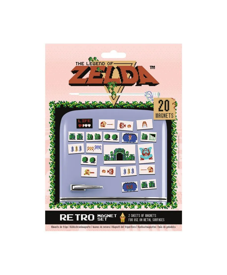 The Legend of Zelda Retro - zestaw magnesów Solidne i wytrzymałe magnesy na lodówkę, magnetyczną ścianę czy tablicę. 18 sztuk magnesów o różnych rozmiarach i kształtach. Idealne dla dzieci, młodzieży i dorosłych. Oryginalne gadżety: Magnesy posiadają oficjalną licencję producenta. W opakowaniu znajdują się: Gumowe magnesy na arkuszu o wymiarach 18x24 cm Marka: Pyramid Posters