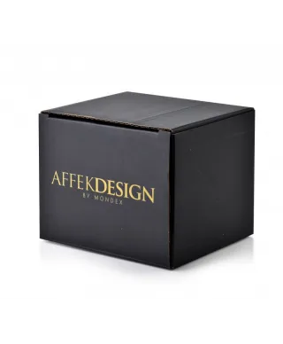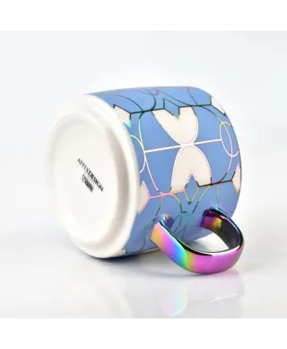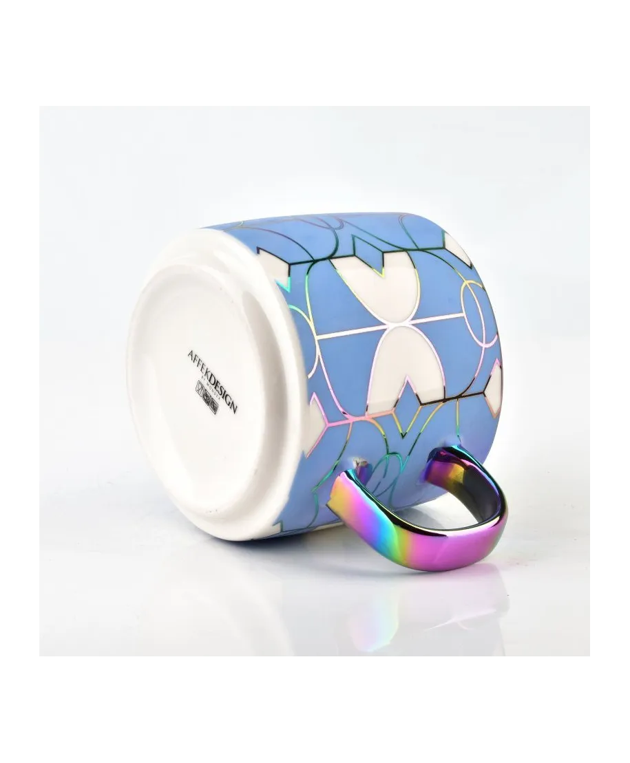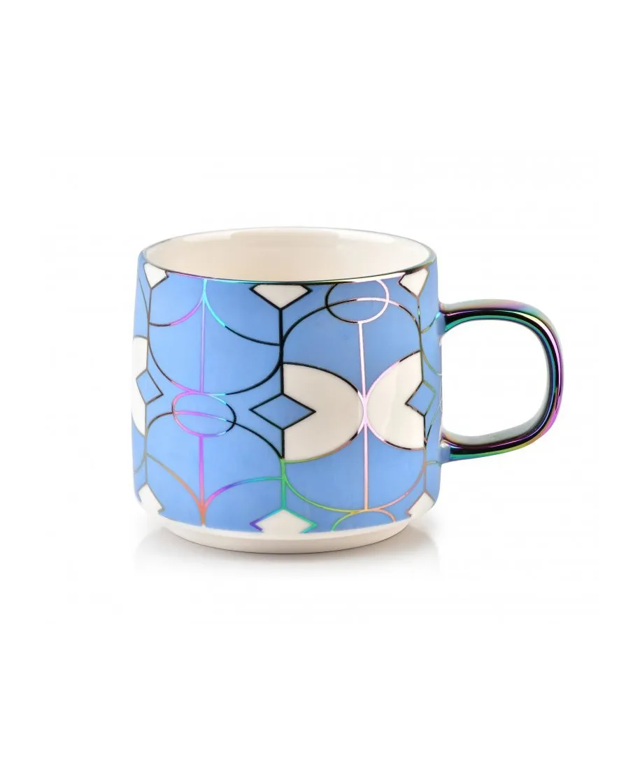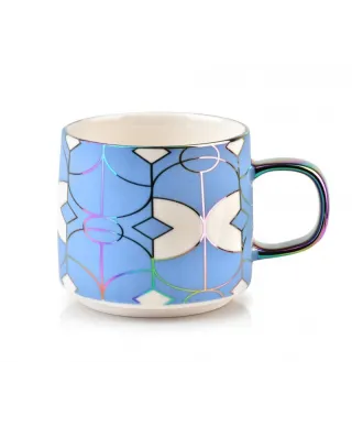 Porcelanowy kubek z serii NEO GEO marki Affek Design.nW kolorze niebieskim a mieniącymi się wzorami geometrycznymi oraz uchem. Zapakowany w ozdobne pudełko.nNie należy używać w zmywarce oraz kuchence mikrofalowej.nnPojemność: 410mlnWymiary kubka:nwysokość: 8.5cmnśrednica z uchem:13cmnśrednica góra: 9.0cmnśrednica dół: 9.7cmnn