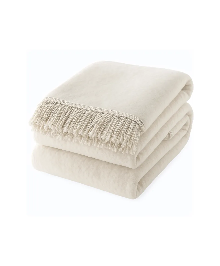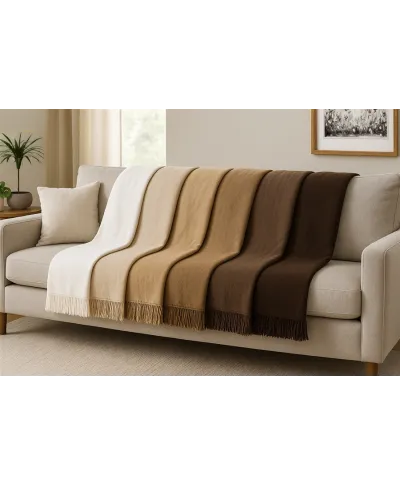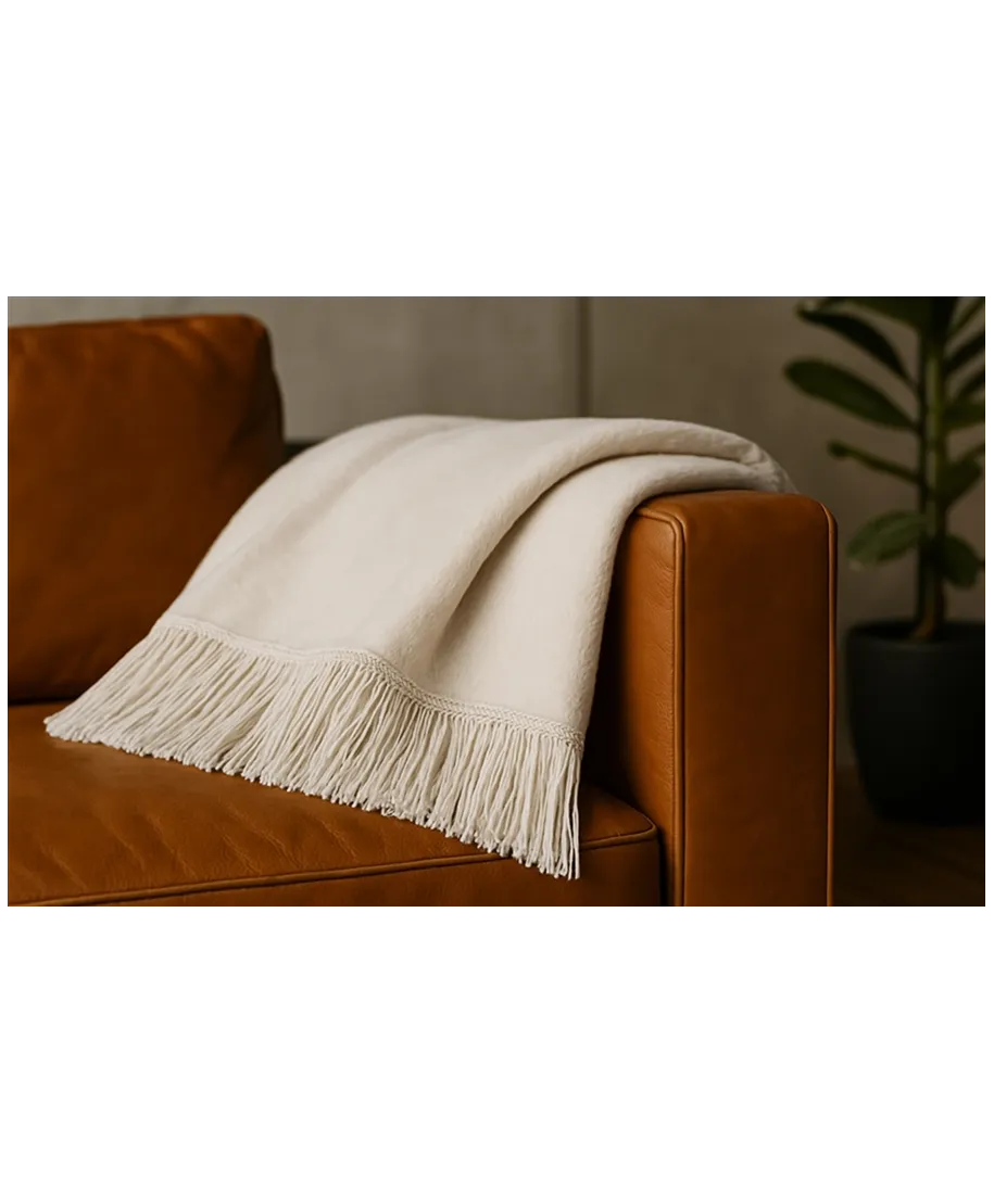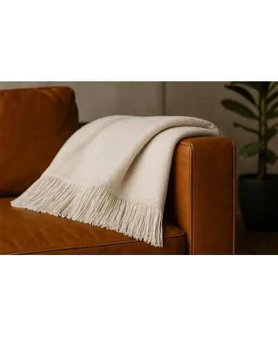Koc elegancko wykończony frędzlami.