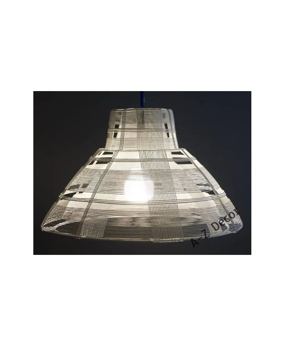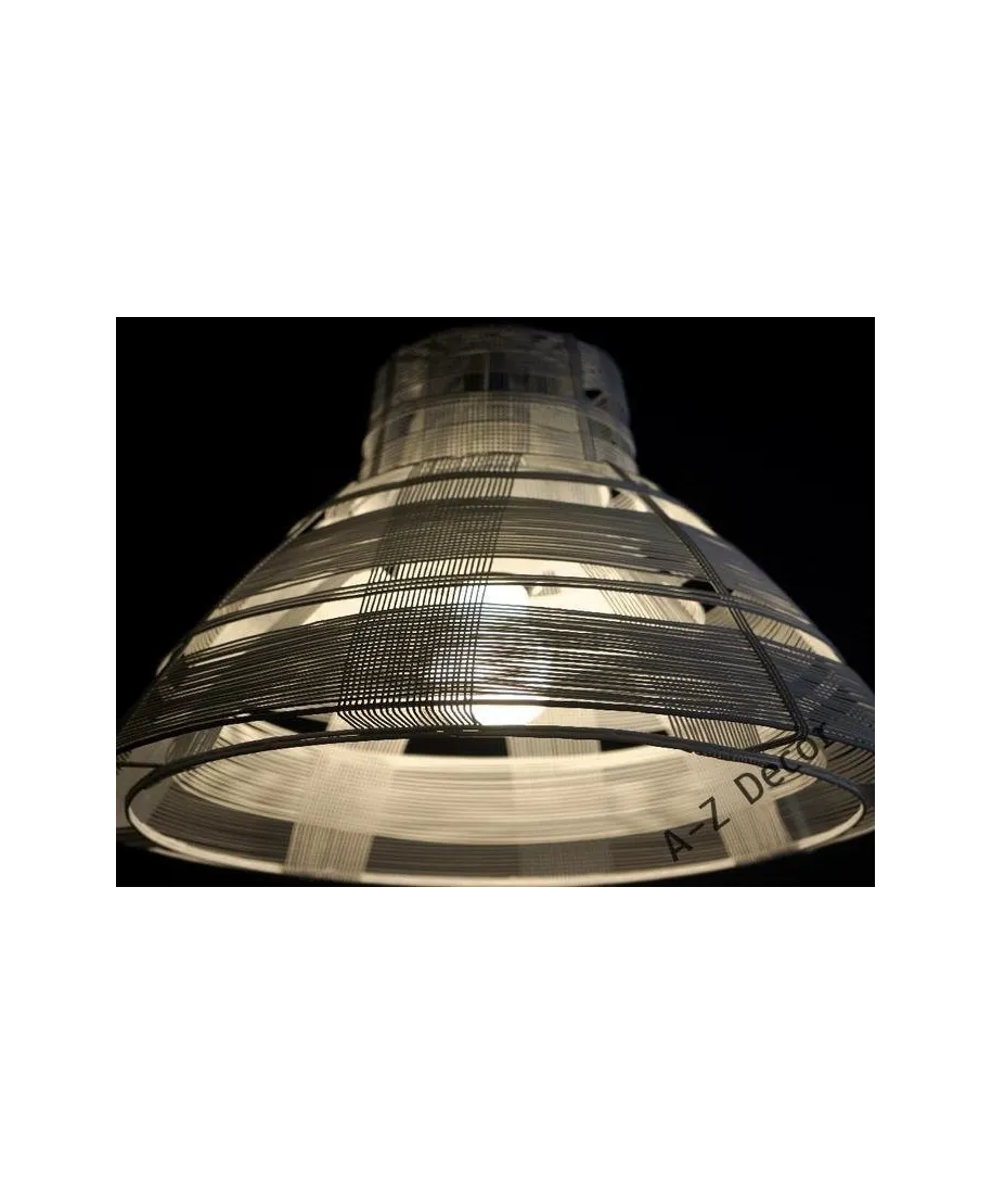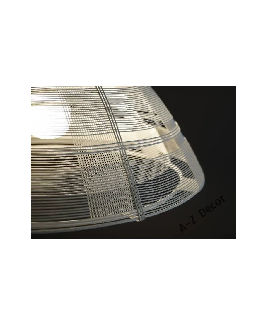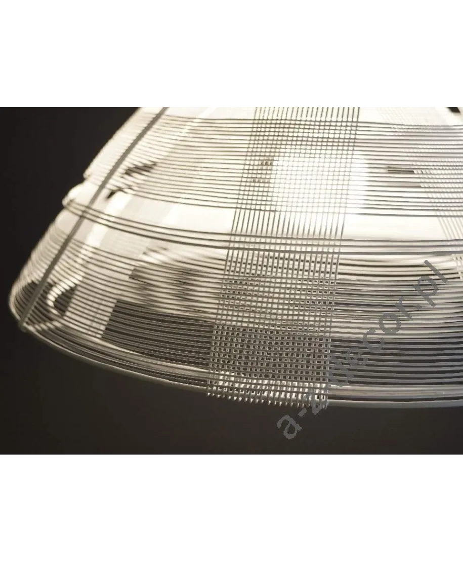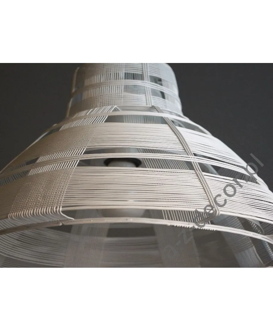 Wykonana z ażuru lampa to przykład ciekawie rozwiązanego pod względem wzorniczym produktu. Abażur jaki posiada ta lampa wisząca to misterna sieć splecionych ze sobą pręcików, które razem tworzą nietypowy wzór. Dzięki zastosowaniu takiej koncepcji światło atrakcyjnie się rozprasza intrygująco oświetlają każde pomieszczenie. Metaliczne srebro wykorzystane do stworzenia tej lampy idealnie współgra z popielatym abażurem. Kabel, który doprowadza do lampy prąd ma z kolei kolor czerwony, co razem tworzy intrygujące zestawienie kolorystyczne.