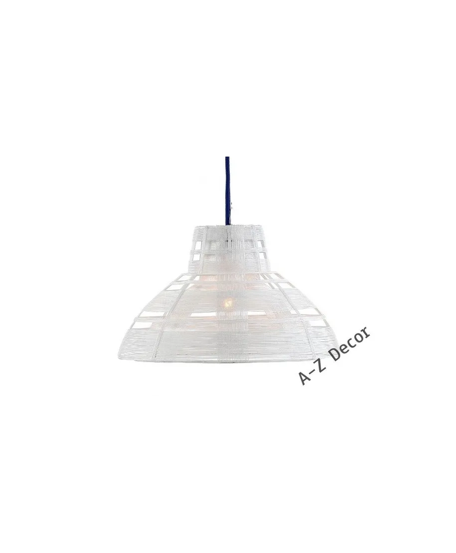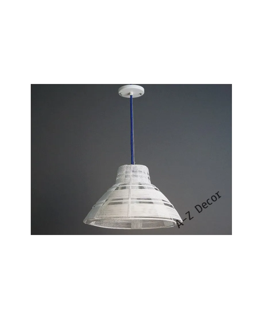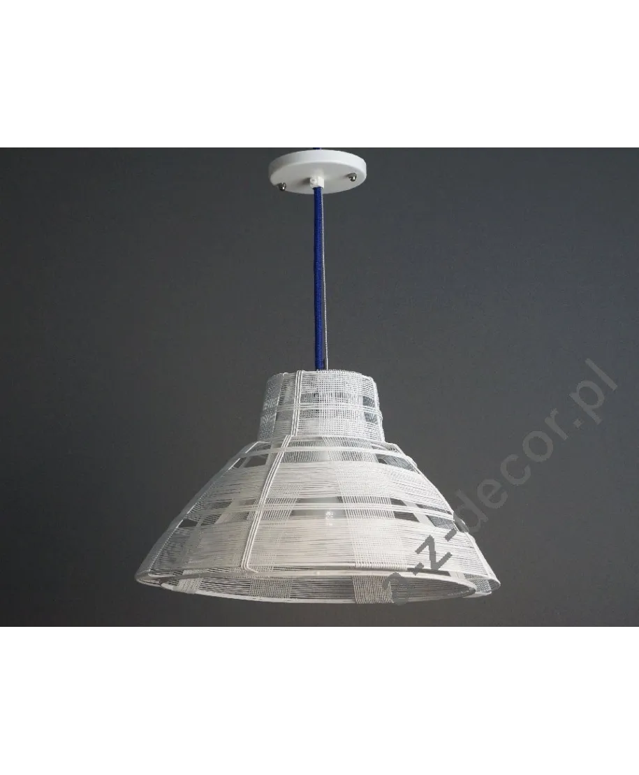 Ażurowe druciki wykorzystane do stworzenia niezwykle atrakcyjnego oraz niebanalnego wzornictwa to zdecydowane atuty jakie prezentuje ta lampa wisząca. Dzięki jej obecności każde pomieszczenie stanie się nie tylko jaśniejsze, ale również na ścianach pojawią się ciekawe refleksy. Lampa wisząca typu „Military” to produkt dla ludzi ceniących sobie nowoczesny styl i awangardowe rozwiązania. Jasna kolorystyka lampy doskonale współgra z szafirowym, wykonanym z materiału kablem. Całość idealnie sprawdzi się w każdym zestawieniu barwnym.