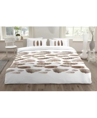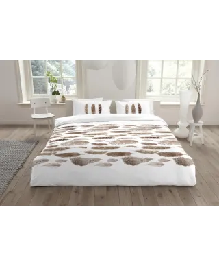 Jasna, utrzymana w biało-brązowej tonacji kolorystyka stanowi tło dla fantazyjnego wzoru, złożonego z różnej wielkości ptasich piór. Poduszki są zadrukowane z obu stron, jedna strona poszwy na kołdrę w jednolitym białym kolorze.