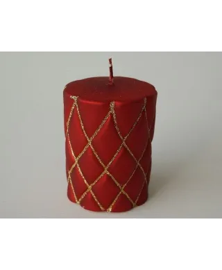 Świeca ozdobna w kolorze czerwieni w matowym wykończeniu w złotą brokatową kratę. Będzie idealnie prezentować się na świątecznym stole.