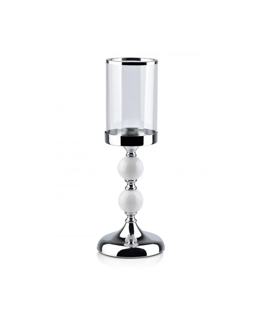 Duży świecznik – Lampion Chantal – Szerokość -13,2 cm x Wysokość - 37 cm.Elegancki świecznik - lampion z serii CHANTAL, składa się z dwóch części: chromowanej srebrnej nogi zdobionej dwiema białymi kulami oraz przezroczystego, szklanego klosza.