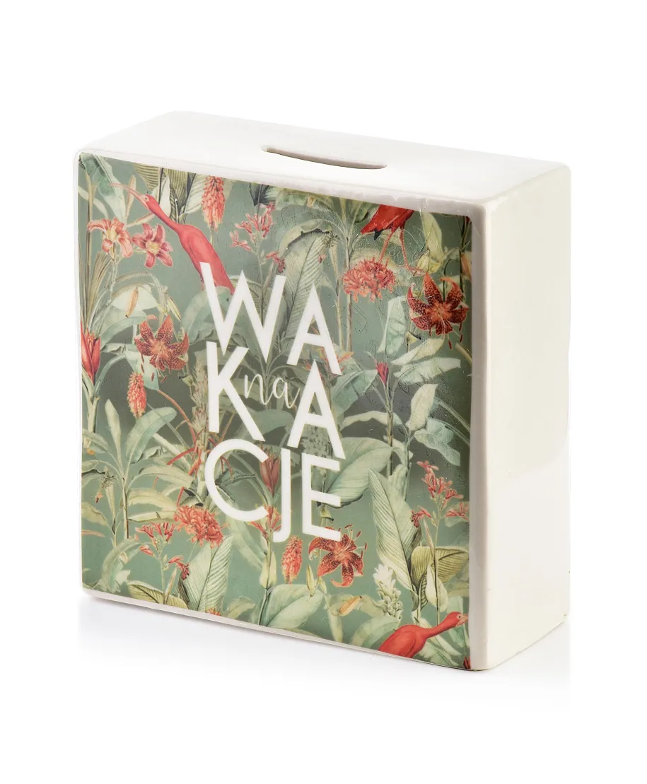 Przestańcie marzyć i zacznijcie oszczędzać ze skarbonką ADI! Nasza piękna, ceramiczna skarbonka jest idealnym sposobem, aby pomóc Państwu w budowaniu następnej wielkiej przygody. Dzięki ponadczasowemu wzornictwu i niezapomnianemu napisowi Na wakacje ta praktyczna skarbonka przynosi dodatkową dawkę radości za każdym razem, gdy wrzucą Państwo do niej kilka monet. Skarbonka ma wymiary 12,8x5,4x12,7CM, dzięki czemu idealnie pasuje na każde biurko lub półkę w sypialni.\\wymiar: 12,8x5,4xh12,7cm\waga 1 szt: 542g\brak jednostkowego opakowania\zapakowana w inner po 6 szt - 28x19xh14cm