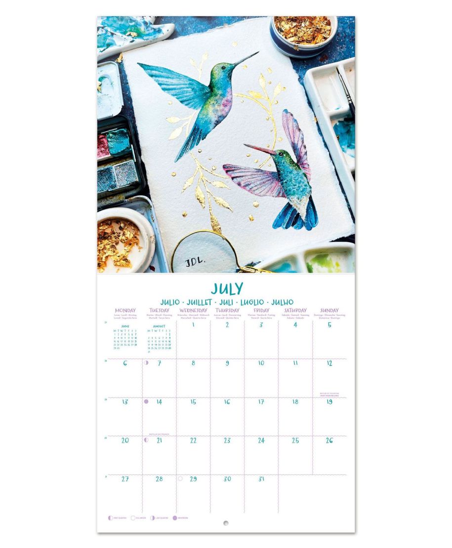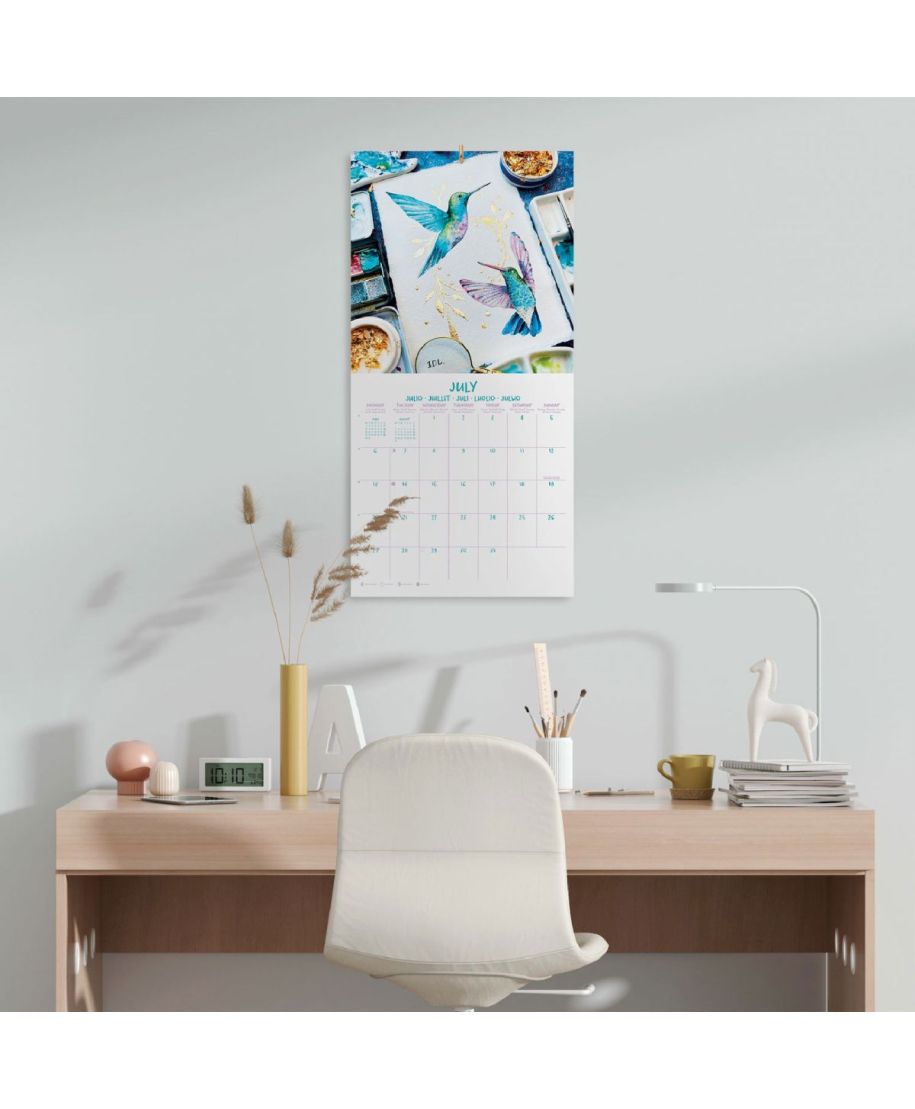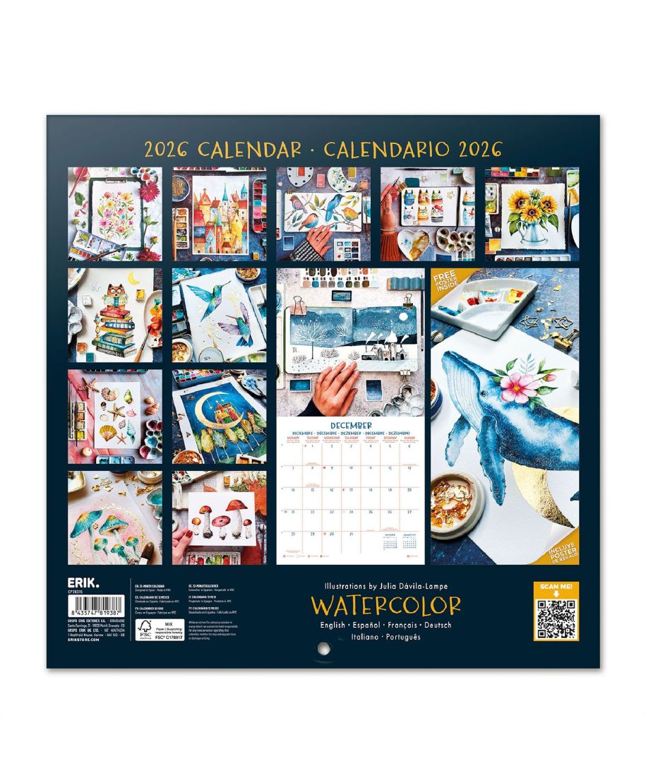 Akwarele oficjalny kalendarz na ścianę na 2026rok Oryginalny i licencjonowany kalendarz, posiada 12 rozkładanych stron o wymiarach 30x60 cm. Na każdej z kart znajduje się duża fotografiaoraz czytelne kalendarium z miejscem na notatki. W kalendarzu znajduje się 12 unikalnych zdjęć dla każdego miesiąca + plakat. Okładki wykonane są z papieru powlekanego matowego i laminowanego o gramaturze 250 g/m2, wnętrze z papieru powlekanego matowego o gramaturze 150 g/m2. Nagłówki są w 6 językach:angielski, hiszpański, francuski, włoski, niemiecki i portugalski. Oprawa zszywkowa. Złożony kalendarz 30x30 cm. Rozłożony kalendarz 30x60 cm. Zawiera otwór 5 mm do zawieszenia na ścianie.