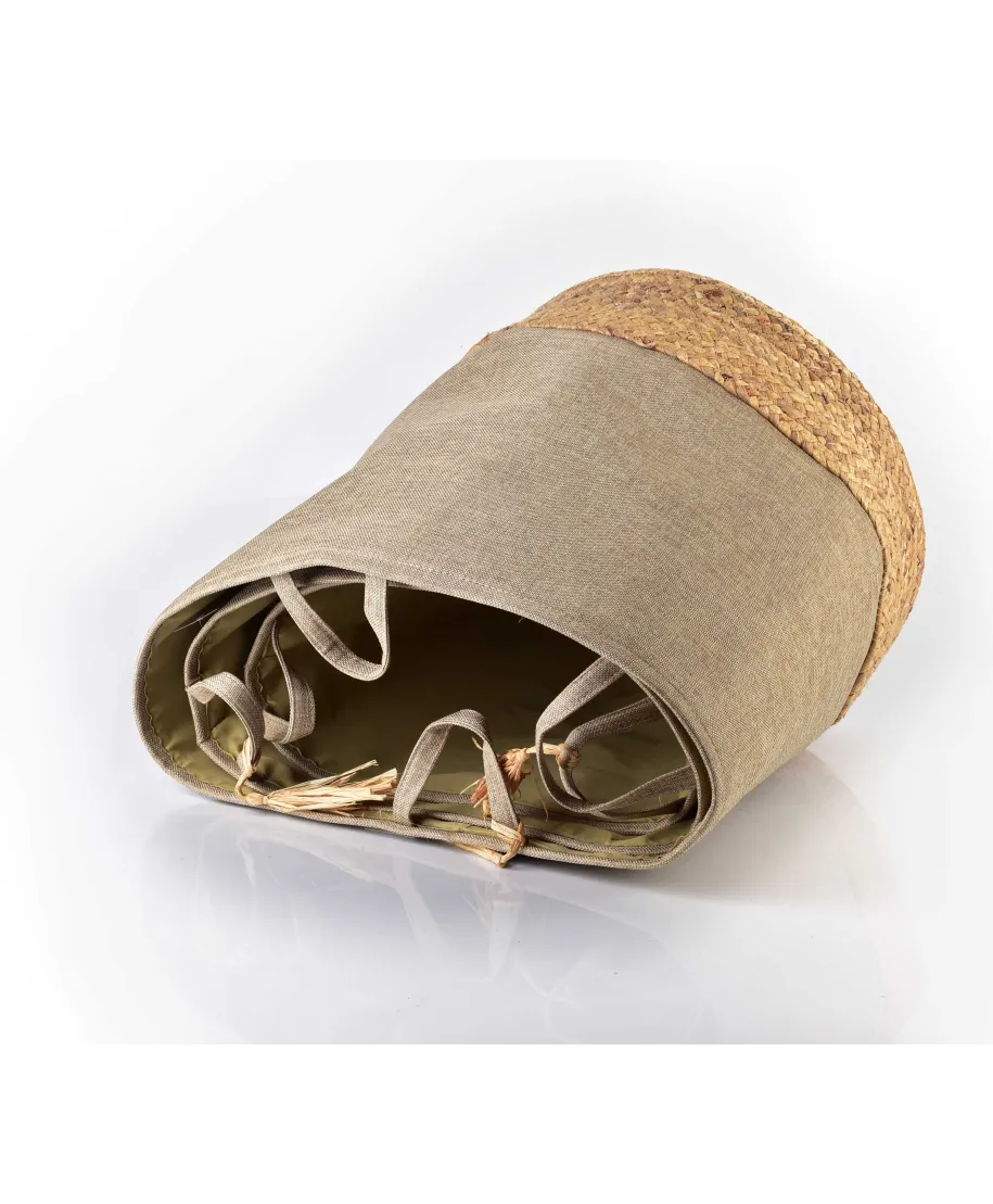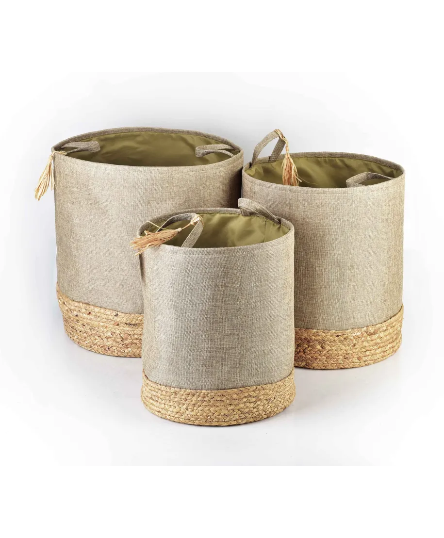 Komplet 3 koszy wykonanych z materiału imitującego fakturą len. Produkt z serii AMPARAO marki MONDEX. Kosze posiadają piękny pas w dolnej części wykonany z hiacyntu wodnego. Kolorystka utrzymana w naturalnych odcieniach beżu. Każdy kosz jest ozdobiony jedną zawieszką z rafii, która dodaje mu niepowtarzalnego uroku.\\AMPARO Komplet KOSZY WYMIARY :\KOSZ L DŁUGOŚĆ 42CM\SZEROKOŚĆ 42CM\WYSOKOŚĆ 46CM\\KOSZ M DŁUGOŚĆ 39CM\SZEROKOŚĆ 39CM\WYSOKOŚĆ 42CM\\KOSZ S DŁUGOŚĆ 34CM\SZEROKOŚĆ 34CM\WYSOKOŚĆ 38CM\\Nie prać, czyścić miejscowo wilgotną ściereczką.\