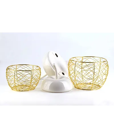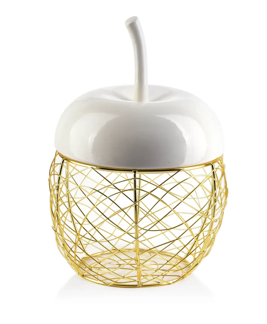 Figura Koszyk z serii APPLE marki MONDEX since 1986. Pokrywa wykonana z porcelany imituje jabłko i stanowi zamknięcie złotego metalowego Koszyka. Całość tworzy niepowtarzalny element dekoracyjny jak i funkcjonalny Koszyk do przechowywania.\Unikalne połączenie kolorystyczne wpasuje się w każde wnętrze.\\wymiar:\16x17xh24cm\wysokość ogonka: 7,5cm\sam Koszyk:\wysokość: 11cm\średnica otworu: 14cm\średnica spodu: 10cm\waga: 584g\\zapakowany jednostkowo w folię - 2 szt w kartonie wewnętrzym / 8 szt w kartonie zbiorczym\\
