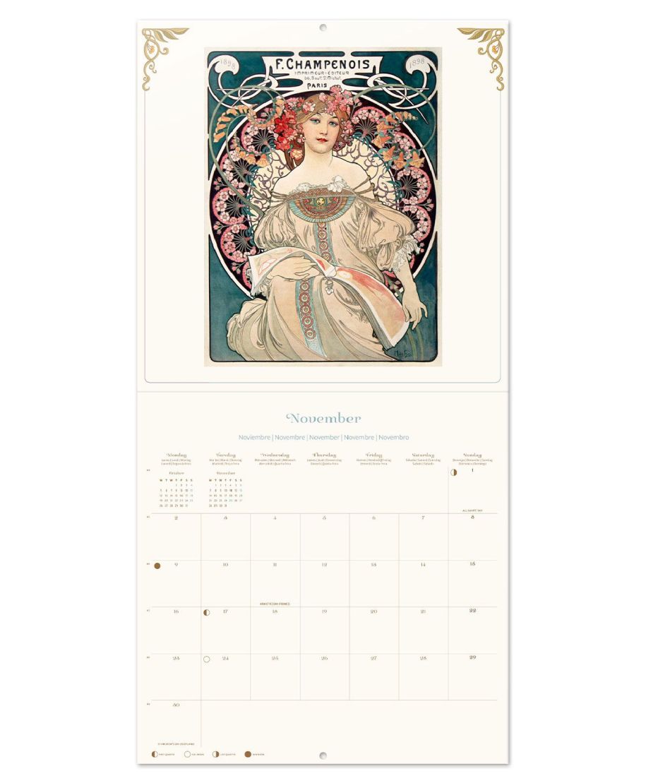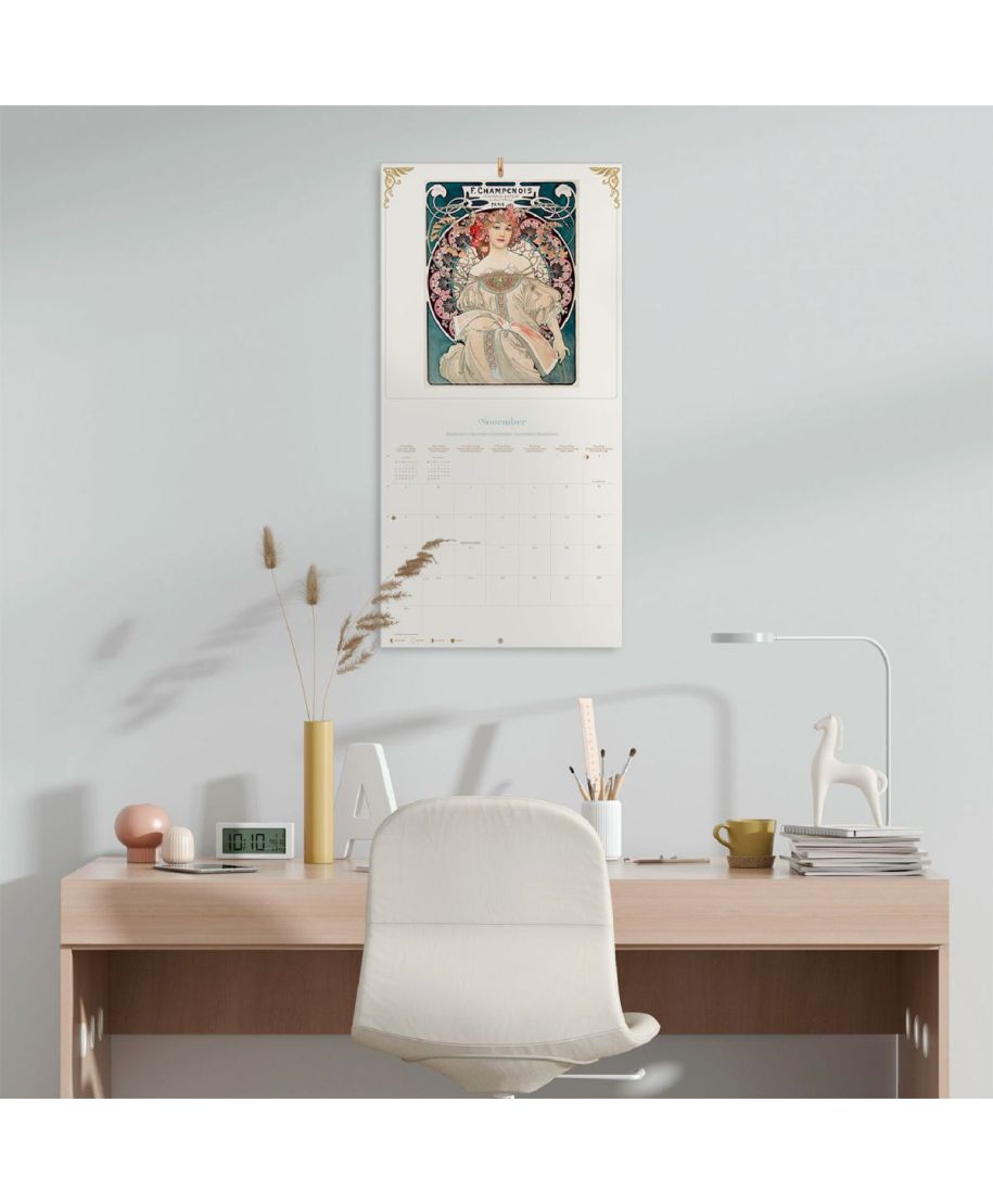 Art Nouveau oficjalny kalendarz na ścianę na 2026rok Oryginalny i licencjonowany kalendarz, posiada 12 rozkładanych stron o wymiarach 30x60 cm. Na każdej z kart znajduje się duża fotografiaoraz czytelne kalendarium z miejscem na notatki. W kalendarzu znajduje się 12 unikalnych zdjęć dla każdego miesiąca + plakat. Okładki wykonane są z papieru powlekanego matowego i laminowanego o gramaturze 250 g/m2, wnętrze z papieru powlekanego matowego o gramaturze 150 g/m2. Nagłówki są w 6 językach:angielski, hiszpański, francuski, włoski, niemiecki i portugalski. Oprawa zszywkowa. Złożony kalendarz 30x30 cm. Rozłożony kalendarz 30x60 cm. Zawiera otwór 5 mm do zawieszenia na ścianie.