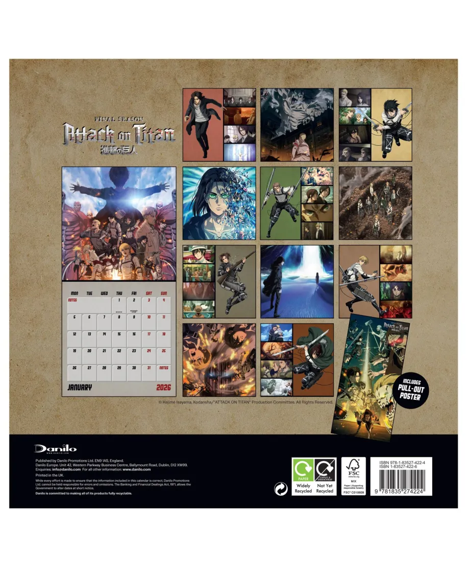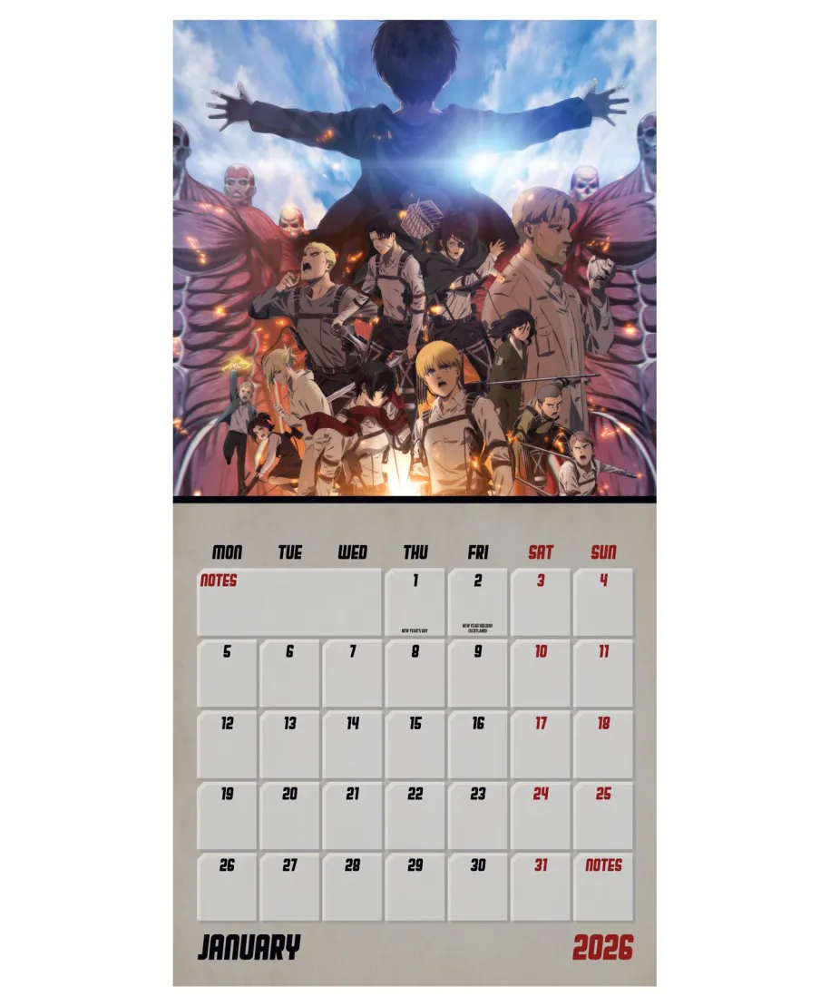 Attack On Titan oficjalny kalendarz na ścianę na 2026rok Oryginalny i licencjonowany kalendarz, posiada 12 rozkładanych stron o wymiarach 30x60 cm. Na każdej z kart znajduje się duża fotografiaoraz czytelne kalendarium z miejscem na notatki. W kalendarzu znajduje się 12 unikalnych zdjęć dla każdego miesiąca + plakat. Okładki wykonane są z papieru powlekanego matowego i laminowanego o gramaturze 250 g/m?, wnętrze z papieru powlekanego matowego o gramaturze 150 g/m?. Nagłówki są w języku angielskim. Oprawa zszywkowa. Złożony kalendarz 30x30 cm. Rozłożony kalendarz 30x60 cm. Zawiera otwór 5 mm do zawieszenia na ścianie.