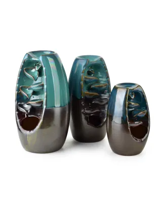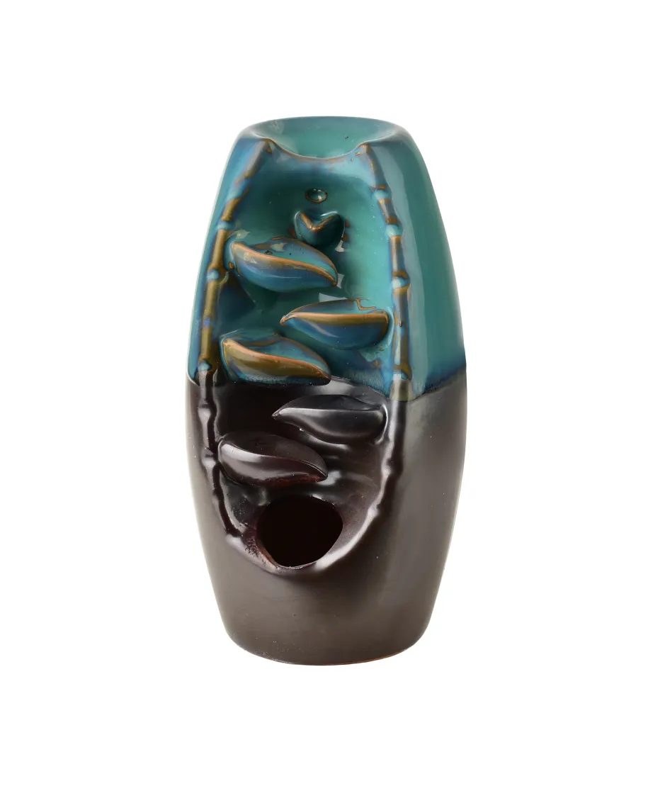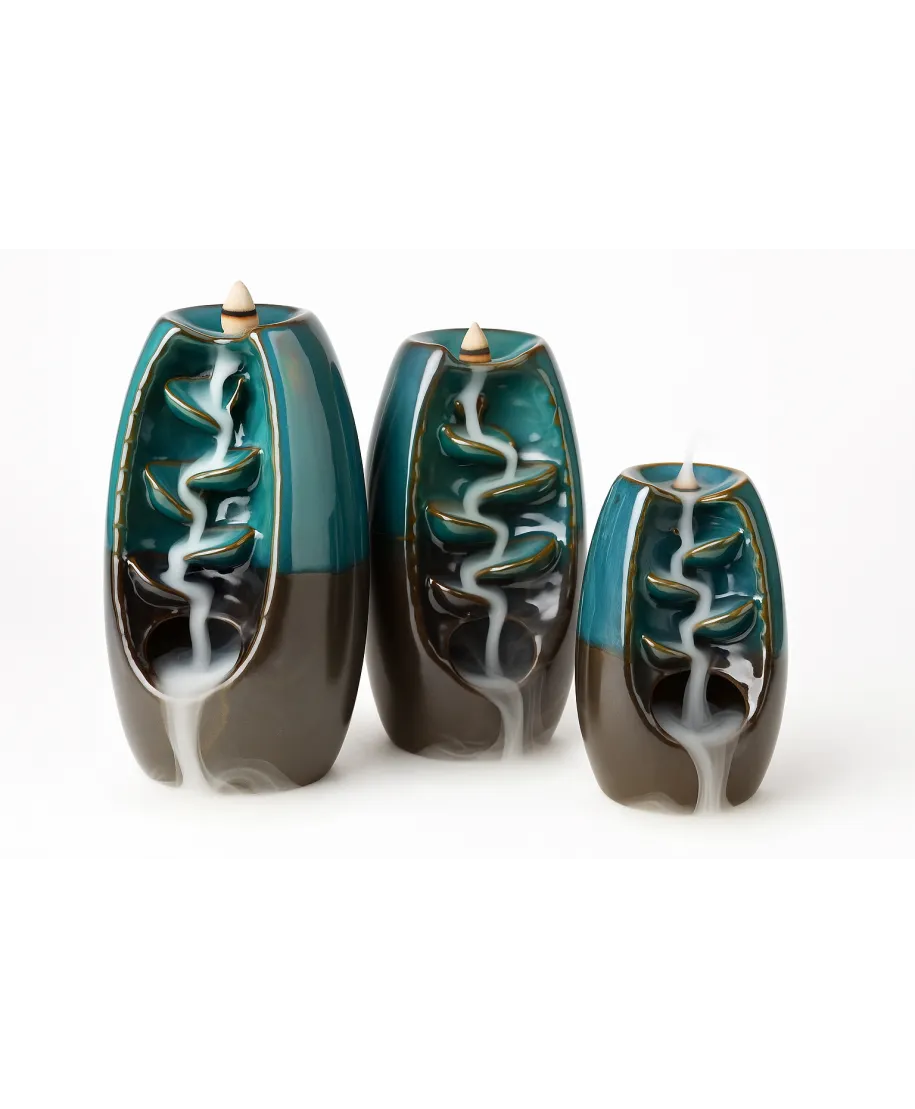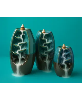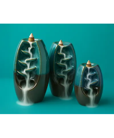 BACKFLOW Kominek ceramiczny. Kominek ceramiczny typu backflow to elegancki i relaksujący element dekoracyjny, który łączy funkcję aromaterapii z unikalnym efektem wizualnym. Dzięki specjalnej konstrukcji dym z kadzidełek spływaw dół niczym mgiełka wodospadu, tworząc hipnotyzujący widok... Wymiary i budowa Wysokość: 17 cm Szerokość i głębokość: 88cm Materiał: Wysokiej jakości ceramika (często szkliwiona) Wymaga specjalnych kadzideł stożkowych typu backflow z otworem u podstawy Dym zamiast unosić się do góry, spływa kaskadowo w dół przez wyprofilowane kanały ceramiczneEfekt: Przypomina płynącą mgłę, wodospad lub dym wijący się po schodach. Relaksacja i medytacja: Doskonały do sesji jogi, masażu, wieczornego relaksu Dekoracja: Idealny element wystroju salonu, sypialni, biura, Kominek należy ustawiać na stabilnej, niepalnej powierzchniZalecane jest używanie na podkładce lub tacy, ponieważ dym może zostawiać osadProdukt przeznaczony do użytku wewnętrznego 8x8x17cm