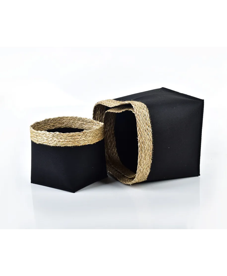 Komplet 3 koszy kwadratowych z serii BALI marki MONDEX. Wykonane z filcu oraz\trawy morskiej. Połączenie koloru czarnego z naturalnym odcieniem wysuszonej trawy\sprawi, iż Twoje wnętrze stanie się wyjątkowe i niepowtarzalne.\Zastosowanie koszy jest wielorakie,\m.in. jako uzupełnienie szuflad aby uporządkować bieliznę, drobiazgi w szafie lub\na komodzie. Dostępny w wielu różnych kształtach i rozmiarach.\KOSZ L DŁUGOŚĆ 31CM\SZEROKOŚĆ 31CM\WYSOKOŚĆ 28CM\KOSZ M DŁUGOŚĆ 28CM\SZEROKOŚĆ 28CM\WYSOKOŚĆ 23CM\KOSZ S DŁUGOŚĆ 23CM\SZEROKOŚĆ 23CM\WYSOKOŚĆ 20CM\