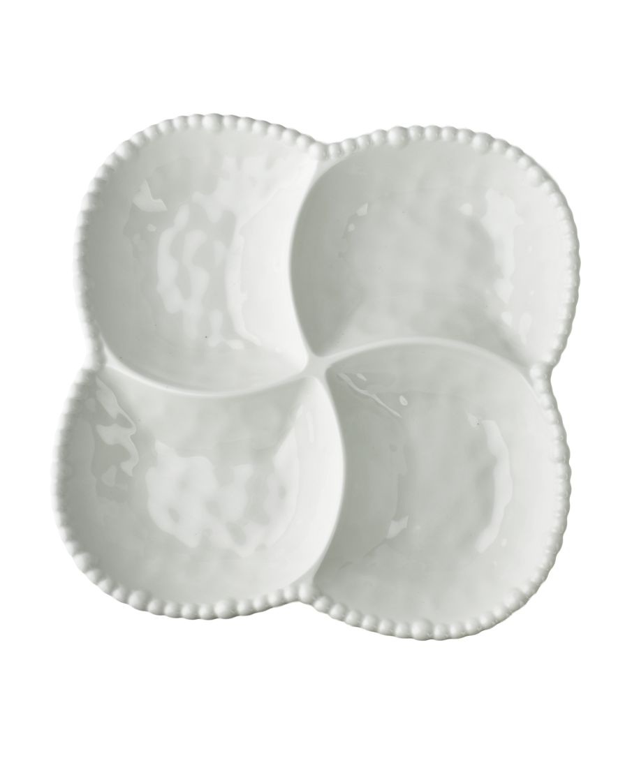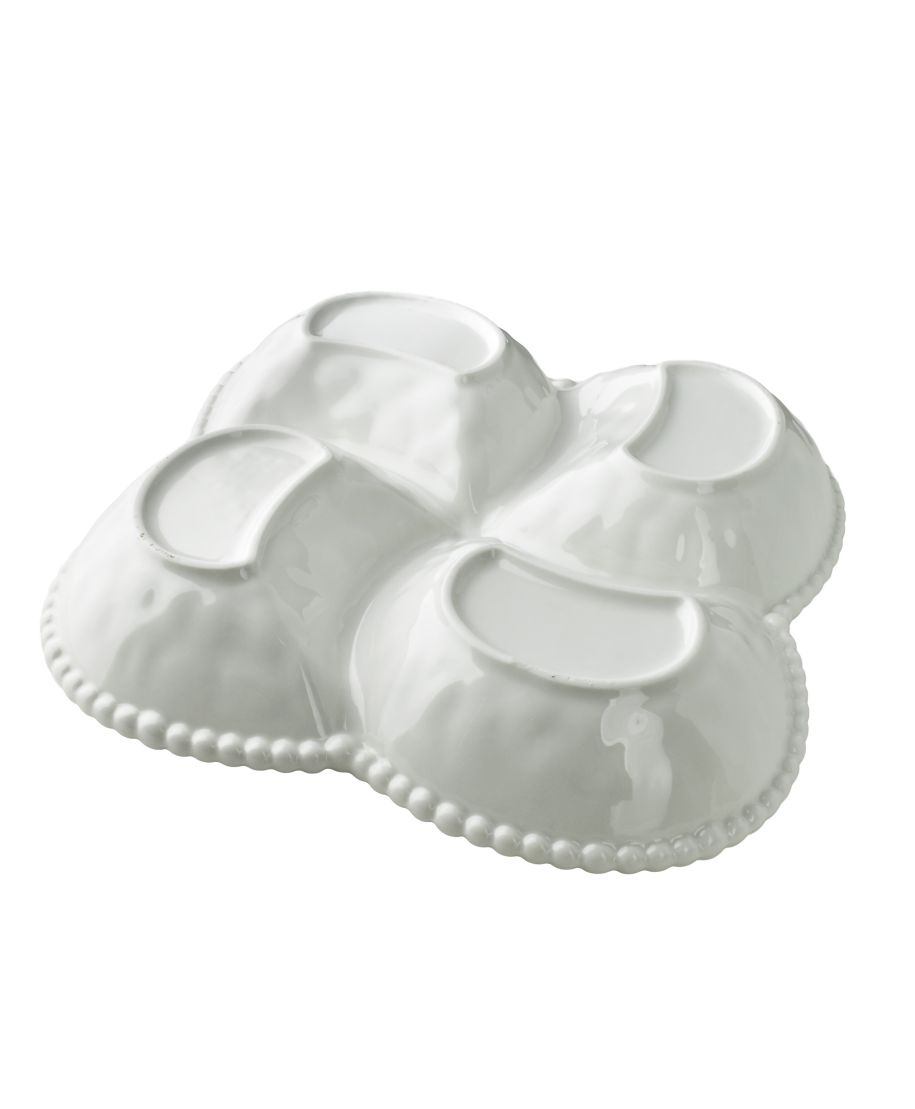 Białe, porcelanowe naczynie czterodzielne prezentuje się elegancko i subtelnie dzięki delikatnym kuleczkom biegnącym dookoła jego krawędzi. Ma klasyczny, lekko zaokrąglony kształt, a cztery symetryczne przegródki pozwalają wygodnie serwować różne przekąski, dodatki lub sosy w jednym naczyniu, zachowując porządek i estetykę podania. Gładka, błyszcząca powierzchnia porcelany podkreśla jego wysoką jakość i sprawia, że świetnie komponuje się zarówno z minimalistyczną zastawą, jak i bardziej dekoracyjnymi elementami stołu. To naczynie łączy praktyczność z eleganckim, ponadczasowym stylem, idealnie nadając się do codziennych posiłków i uroczystych przyjęć.II gatuenkwaga: 1,05kgwymiar: 25x25x5cm
