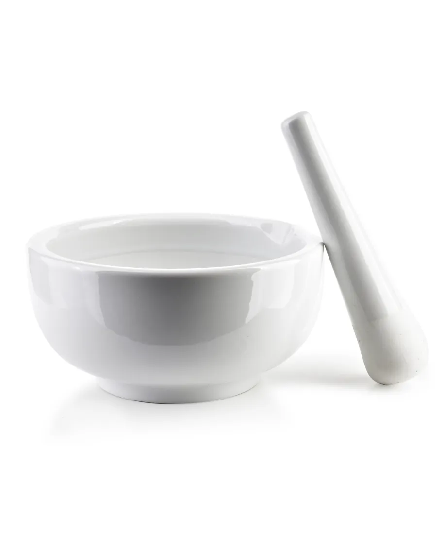 Duży moździerz z serii BASIC. Wykonany z porcelany.\Nadaje się do zmywarki.\15xh7,8cm\długość tłuczka: 14,5cm\szerokość tłuczka:3cm/1,2cm\waga: 932g\\II gatunek
