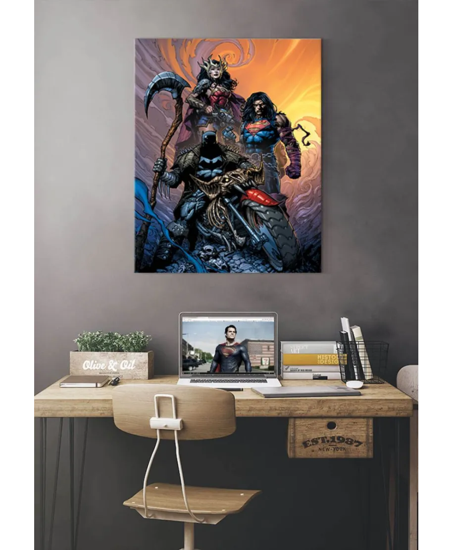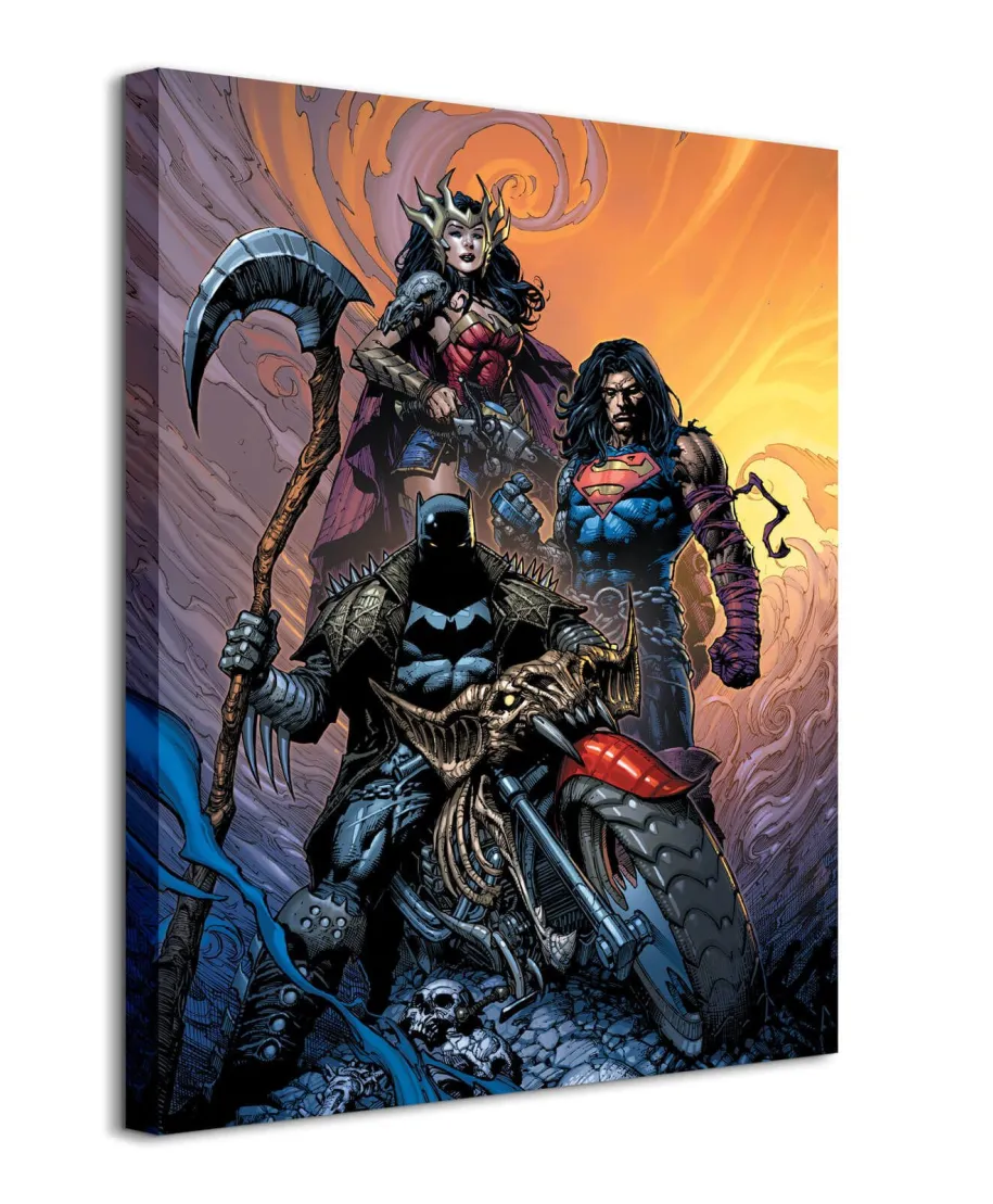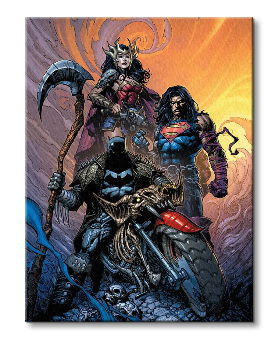 Batman Death Metal Champions - obraz na płótnie Oryginalny i licencjonowany obraz na płótnie idealny na każdą ścianę. Nasze obrazy wyróżniają: Fantastyczne barwy Wysokie nasycenie barw i ostrość, kolory utrzymują się przez długie lata. Płótno wysokiej jakości Płótno bawełniane 300g/m2 jest trwałe i mocne, jego struktura jest naturalna. Trwałe kolory, Dodatkowo lakierowana powierzchnia sprawia, że kolory są żywe przez dziesięciolecia. Solidna rama, Wykonana jest z naturalnego, sosnowego drewna, jest mocna i gruba a obraz solidny i wytrzymały. Zadrukowane boki, obrazy posiadają zadrukowane boki, nie potrzebują żadnej dodatkowej oprawy. Szczegóły techniczne: wydruk na płótnie bawełnianym 300g/m2 sosnowe krosna o grubości 2 cm i szerokości 3,5 cm druk cyfrowy