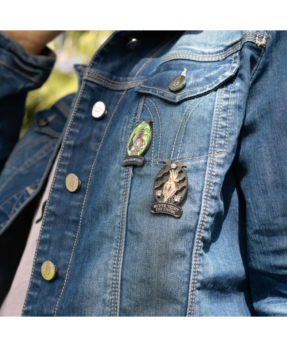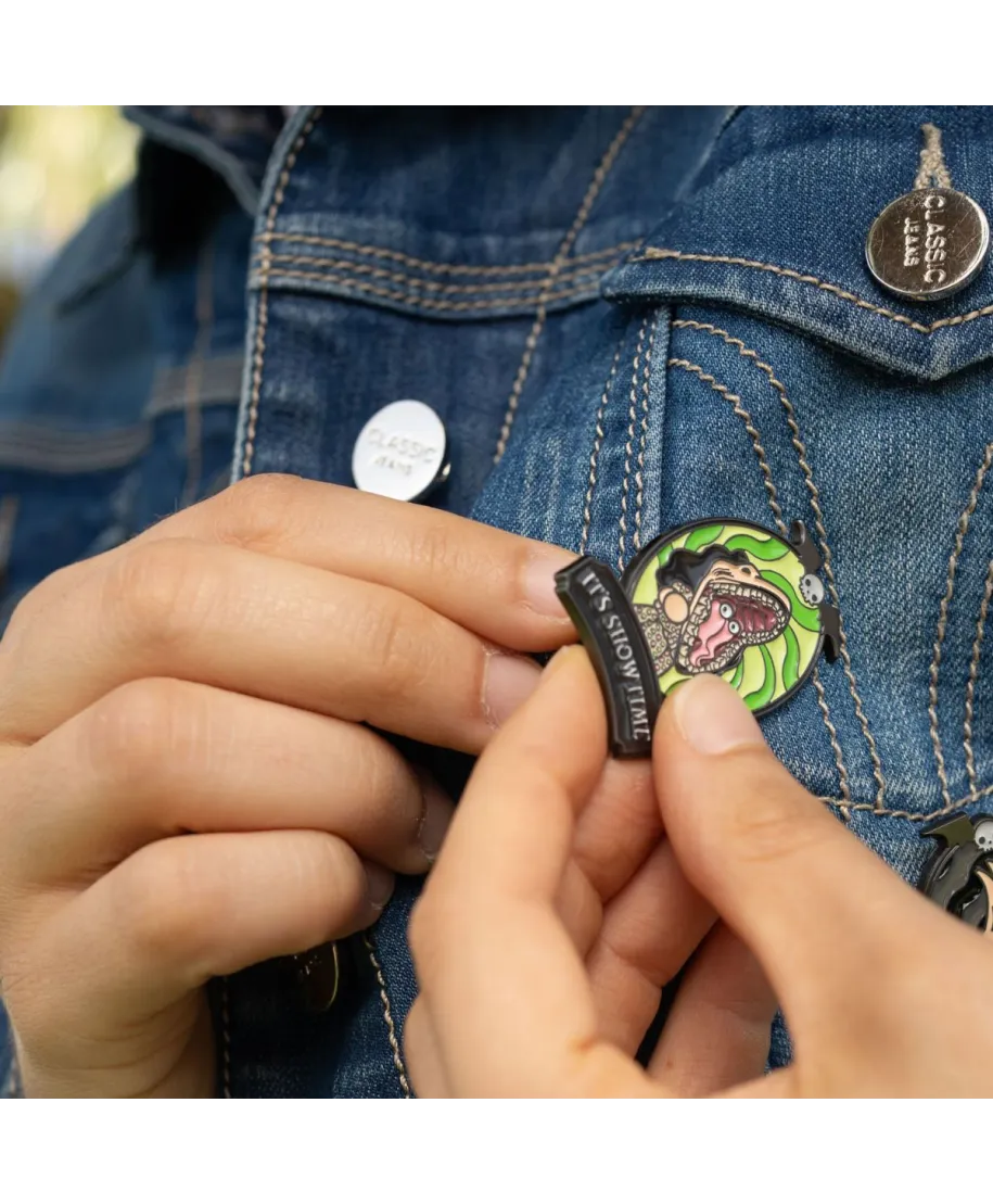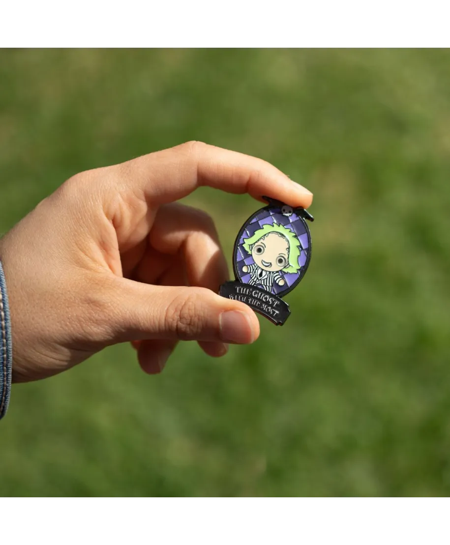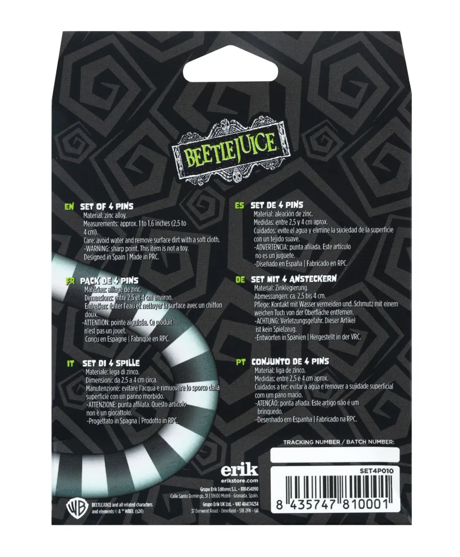 Beetlejuice - zestaw 4 przypinek Zestaw czterech przypinek z filmu Beetlejuice to wyjątkowy dodatek dla fanów tej mrocznej komedii. Każda przypinka wykonana z wysokiej jakości stopu cynku, ozdobiona trwałą emalią. Zapakowane w stylowe pudełko z okienkiem, idealne na prezent. Szczegóły techniczne: Wymiary: od 2,5 do 4 cm Materiał: Stop cynku, emaliowane Opakowanie: Pudełko ochronne z okienkiem Licencjonowany produkt Oryginalny produkt Beetlejuice, doskonały wybór na prezent dla fanów filmu.