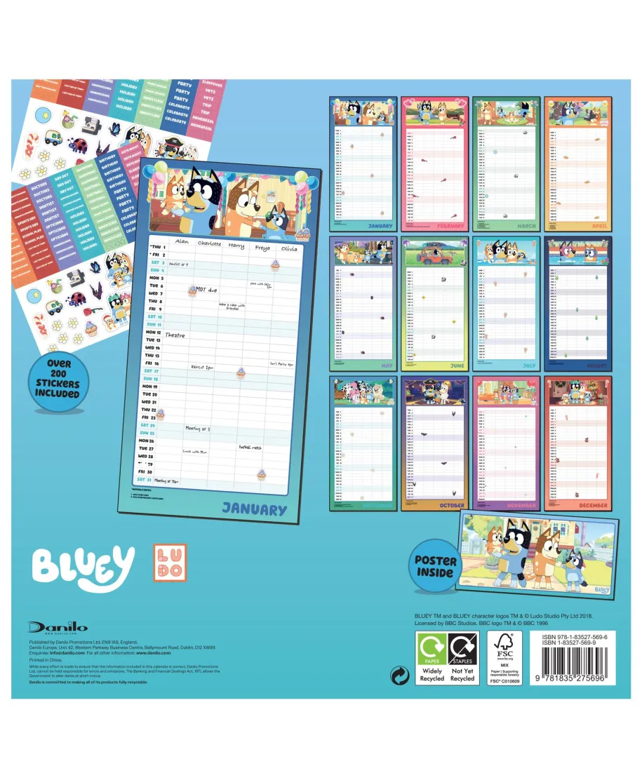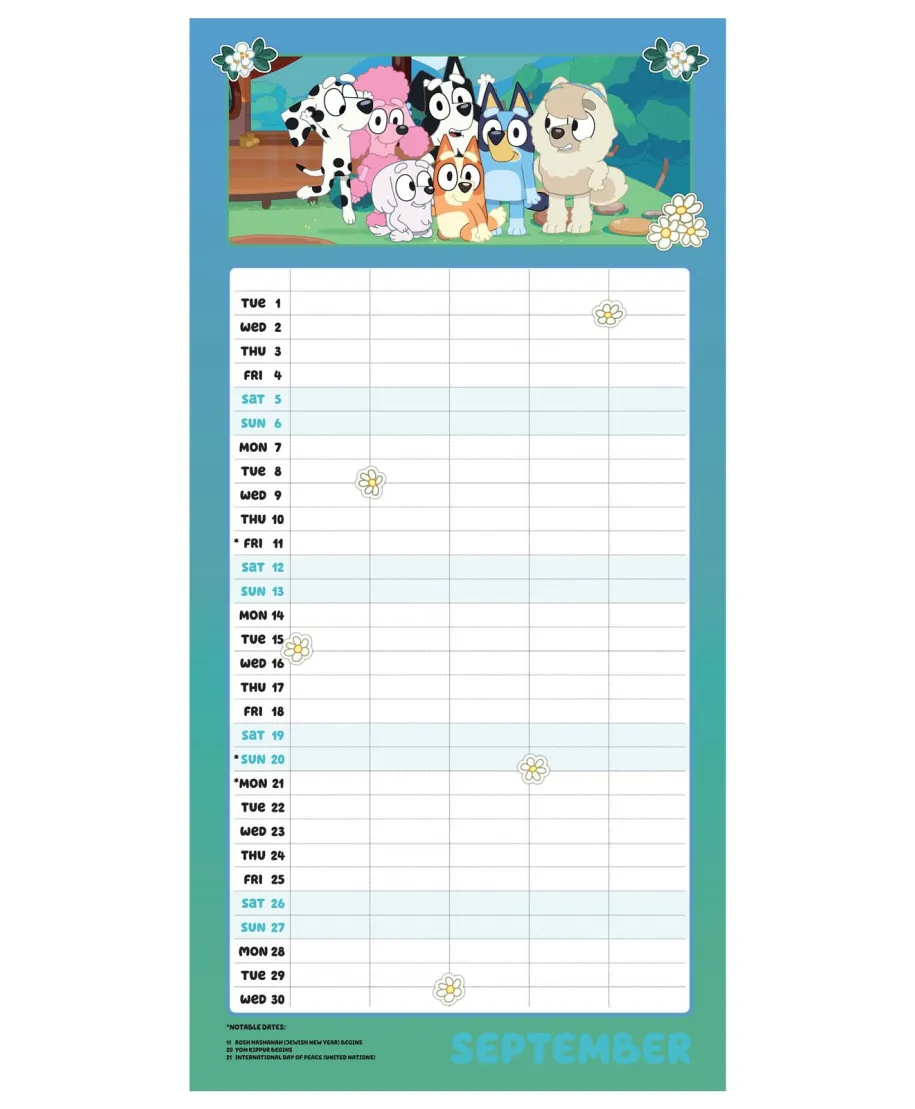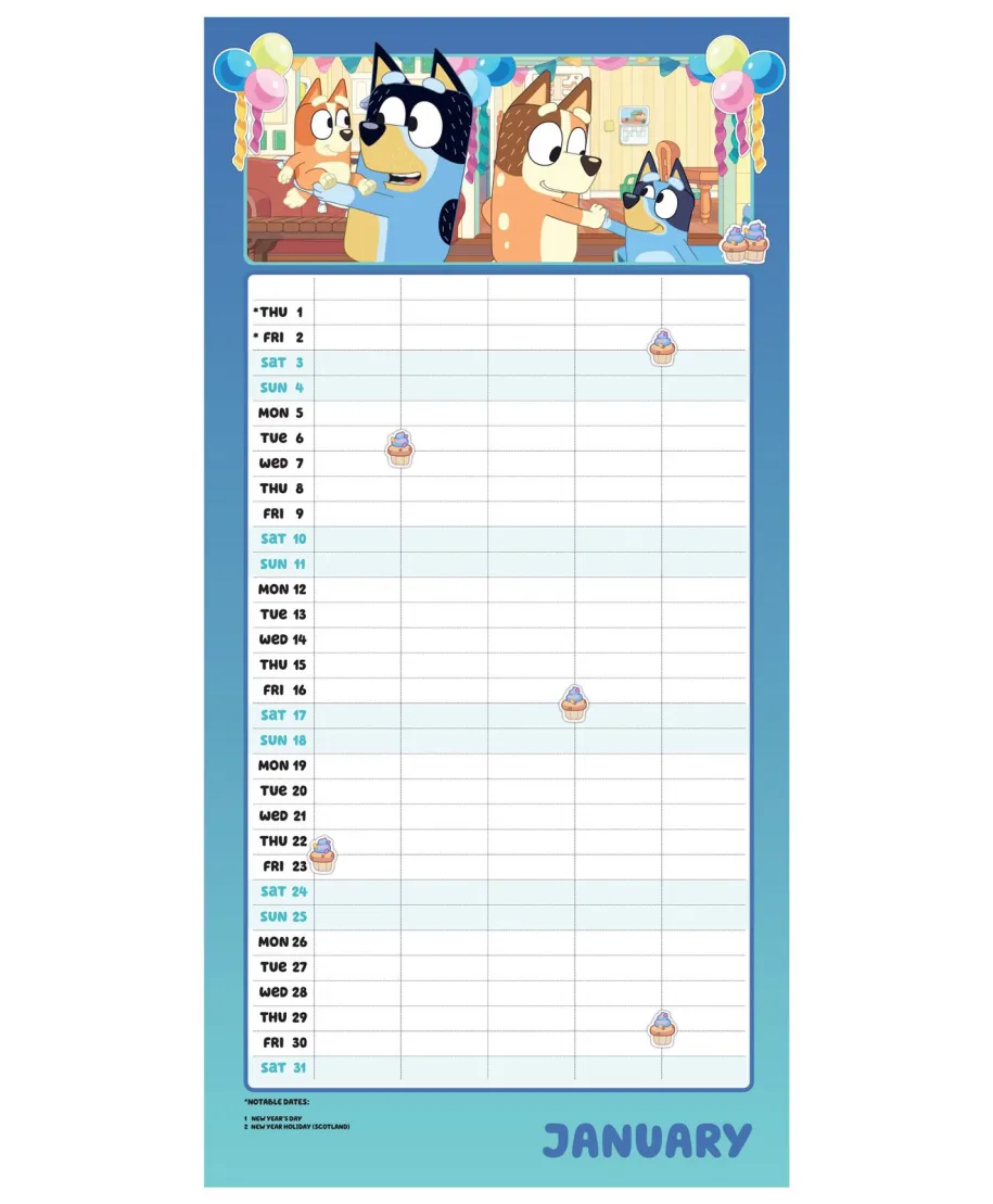 Bluey oficjalny kalendarz na ścianę na 2026rok Oryginalny i licencjonowany kalendarz, posiada 12 rozkładanych stron o wymiarach 30x60 cm. Na każdej z kart znajduje się duża fotografiaoraz czytelne kalendarium z miejscem na notatki. W kalendarzu znajduje się 12 unikalnych zdjęć dla każdego miesiąca + plakat. Okładki wykonane są z papieru powlekanego matowego i laminowanego o gramaturze 250 g/m?, wnętrze z papieru powlekanego matowego o gramaturze 150 g/m?. Nagłówki są w języku angielskim. Oprawa zszywkowa. Złożony kalendarz 30x30 cm. Rozłożony kalendarz 30x60 cm. Zawiera otwór 5 mm do zawieszenia na ścianie.