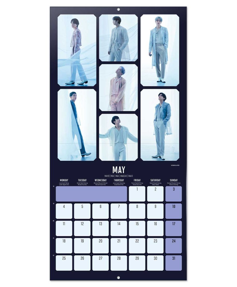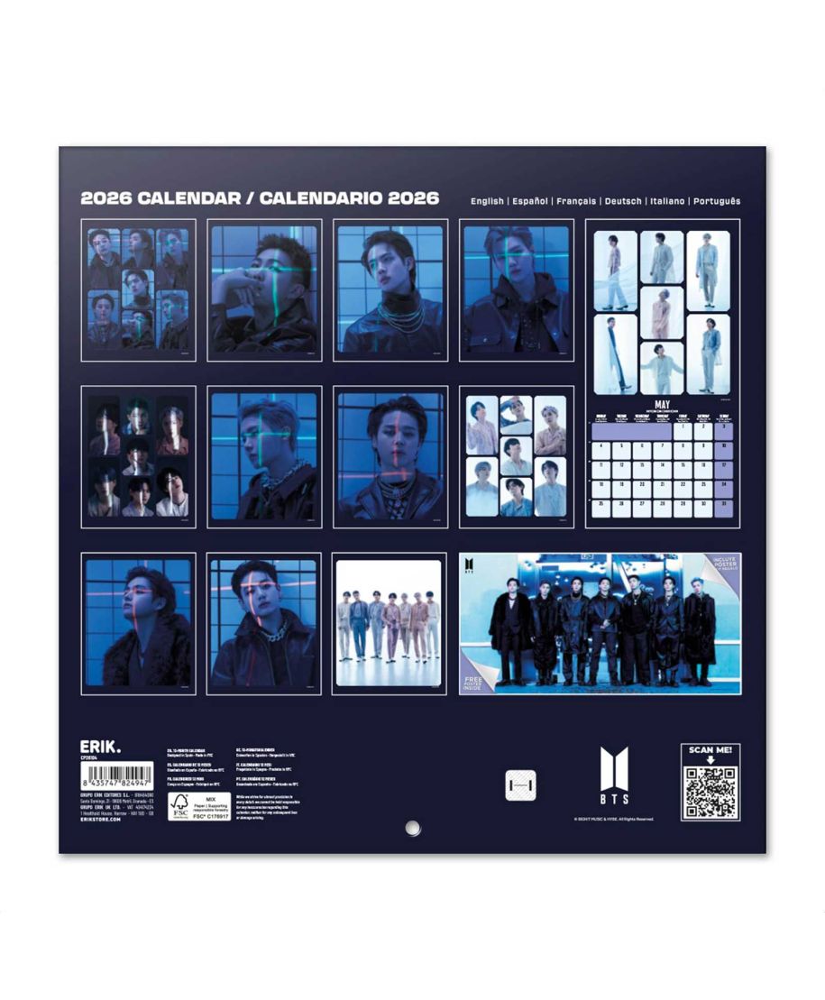 BTS oficjalny kalendarz na ścianę na 2026rok Oryginalny i licencjonowany kalendarz, posiada 12 rozkładanych stron o wymiarach 30x60 cm. Na każdej z kart znajduje się duża fotografiaoraz czytelne kalendarium z miejscem na notatki. W kalendarzu znajduje się 12 unikalnych zdjęć dla każdego miesiąca + plakat. Okładki wykonane są z papieru powlekanego matowego i laminowanego o gramaturze 250 g/m2, wnętrze z papieru powlekanego matowego o gramaturze 150 g/m2. Nagłówki są w 6 językach:angielski, hiszpański, francuski, włoski, niemiecki i portugalski. Oprawa zszywkowa. Złożony kalendarz 30x30 cm. Rozłożony kalendarz 30x60 cm. Zawiera otwór 5 mm do zawieszenia na ścianie.