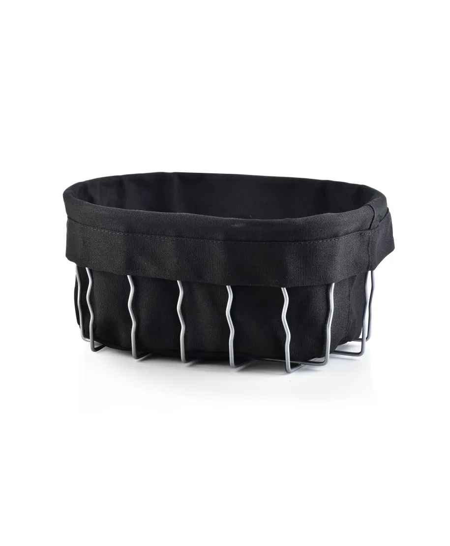 CASSIE Koszyk marki COOKINI.\Owalny metalowy,koszyk z serii CASSIE marki COOKINI. Wyścielany czarnym\materiałem. Idealny na stół kuchenny do podawania pieczywa lub do przechowywaniaóżnych drobiazgów. Metal w kolorze srebra.\wymiary 22x15xh10cm\zapakowany jednostkowo w folię\\\\
