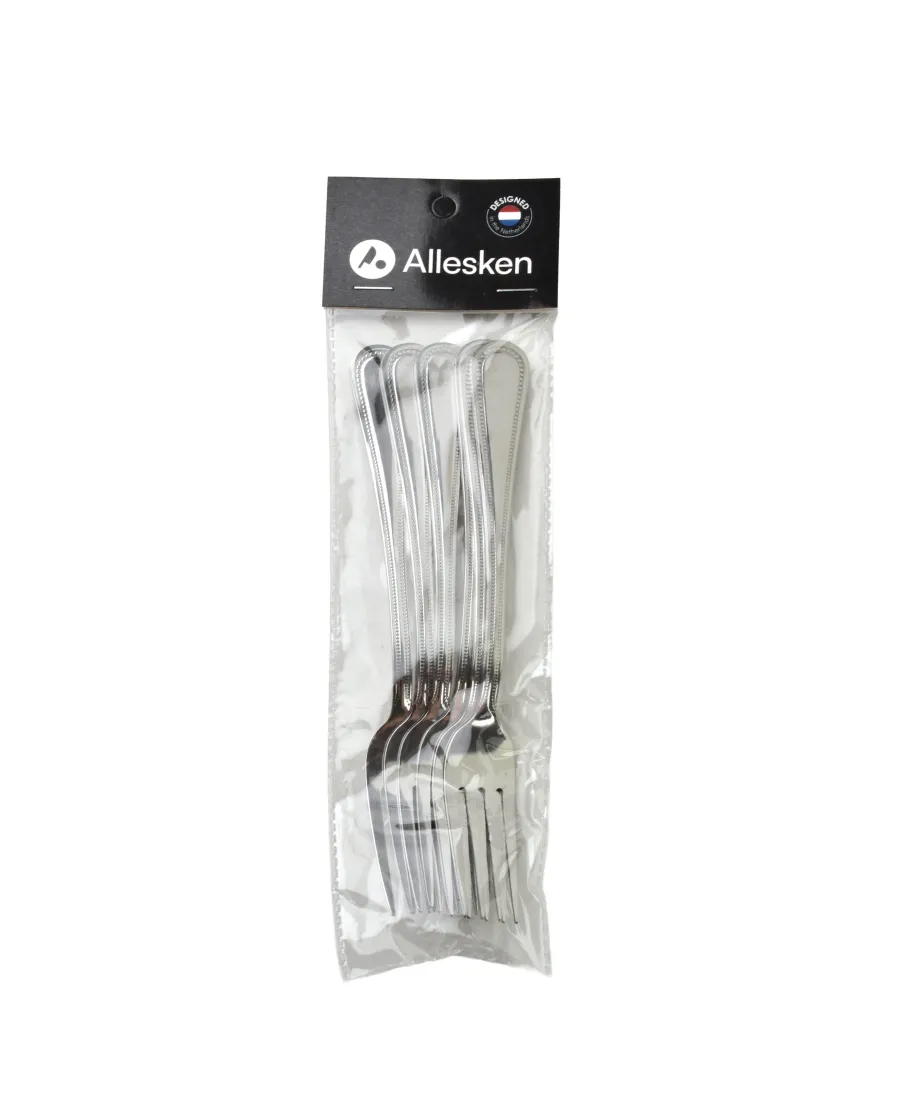 Zestaw CHAMOMILE Komplet 6 widelców ze stali nierdzewnej 18/10 marki Allesken to elegancki komplet sztućców, idealny zarówno do codziennego użytku, jak i na specjalne okazje. Specyfikacja Materiał: stal nierdzewna 18/10 (18% chromu, 10% niklu), zapewniająca wysoką odporność na korozję i trwałość.Nie zlaeca się mycia w zmywarce