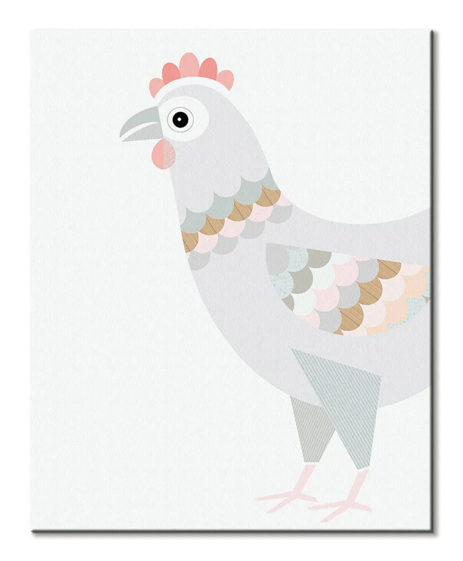 Chicken - obraz na płótnie Oryginalny i licencjonowany obraz na płótnie idealny na każdą ścianę. Nasze obrazy wyróżniają: Fantastyczne barwy Wysokie nasycenie barw i ostrość, kolory utrzymują się przez długie lata. Płótno wysokiej jakości Płótno bawełniane 300g/m2 jest trwałe i mocne, jego struktura jest naturalna. Trwałe kolory, Dodatkowo lakierowana powierzchnia sprawia, że kolory są żywe przez dziesięciolecia. Solidna rama, Wykonana jest z naturalnego, sosnowego drewna, jest mocna i gruba a obraz solidny i wytrzymały. Zadrukowane boki, obrazy posiadają zadrukowane boki, nie potrzebują żadnej dodatkowej oprawy. Szczegóły techniczne: wydruk na płótnie bawełnianym 300g/m2 sosnowe krosna o grubości 2 cm i szerokości 3,5 cm druk cyfrowy