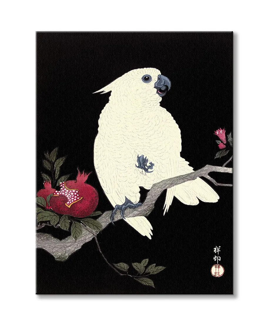 Cockatoo and Pomegranate - obraz na płótnie Oryginalny i licencjonowany obraz na płótnie idealny na każdą ścianę. Nasze obrazy wyróżniają: Fantastyczne barwy Wysokie nasycenie barw i ostrość, kolory utrzymują się przez długie lata. Płótno wysokiej jakości Płótno bawełniane 300g/m2 jest trwałe i mocne, jego struktura jest naturalna. Trwałe kolory, Dodatkowo lakierowana powierzchnia sprawia, że kolory są żywe przez dziesięciolecia. Solidna rama, Wykonana jest z naturalnego, sosnowego drewna, jest mocna i gruba a obraz solidny i wytrzymały. Zadrukowane boki, obrazy posiadają zadrukowane boki, nie potrzebują żadnej dodatkowej oprawy. Szczegóły techniczne: wydruk na płótnie bawełnianym 300g/m2 sosnowe krosna o grubości 2 cm i szerokości 3,5 cm druk cyfrowy