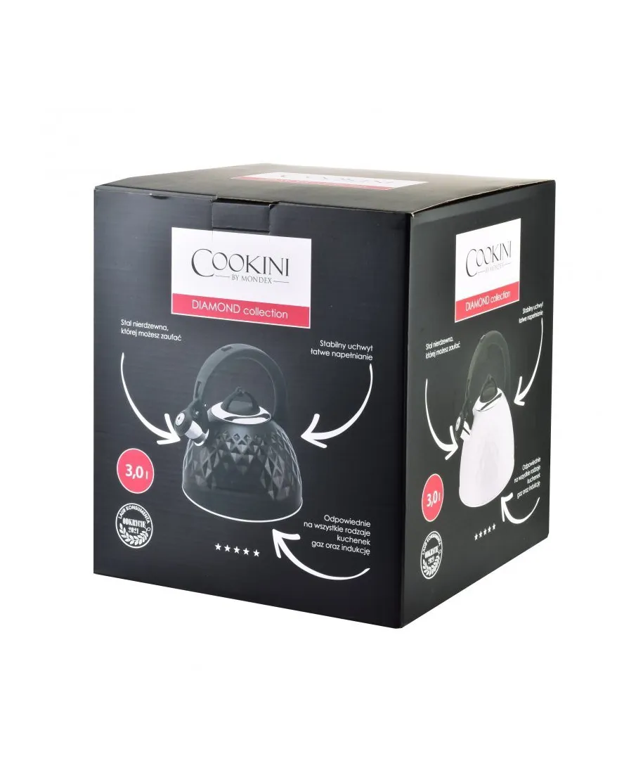 Czajnik DIAMOND marki Cookini. Czarny czajnik marki COOKINI - wyjątkowo praktyczny i estetyczny. Jeśli szukasz czajnika do gotowania wody, który zapewnia trwałość i nieprzeciętną jakość to czajnik marki COOKINI to idealny wybór dla Ciebie. Wykonany z trwałej stali nierdzewnej, czajnik jest odporny na uszkodzenia i zacieki. Jego powierzchnia jest odporna na zarysowania i łatwa w czyszczeniu. Dzięki swojej funkcjonalności, praktycznemu wyglądowi i stylowi wykończeniom, czajnik marki COOKINI jest idealnym dodatkiem do każdej kuchni. Czajnik ma regulowaną moc grzewczą i ochronne zabezpieczenia przed przegrzaniem, dzięki czemu łatwo jest nim kontrolować temperaturę gotowanej wody. Dodatkowo, jego szeroki uchwyt sprawia, że bezpiecznie można go przenosić. Czajnik marki COOKINI jest wyposażony we wskaźnik poziomu wody, co ułatwia kontrolowanie ilości do gotowania i uniknięcie zbędnych czasochłonnych czynności. Czajnik marki COOKINI to wyjątkowa propozycja dla wszystkich, którzy cenią sobie trwałość i jakość. pojemność: 3,0L wymiary:22x24xh25cm waga:612g/792g z opakowaniem zapakowany jednostkowo w color box
