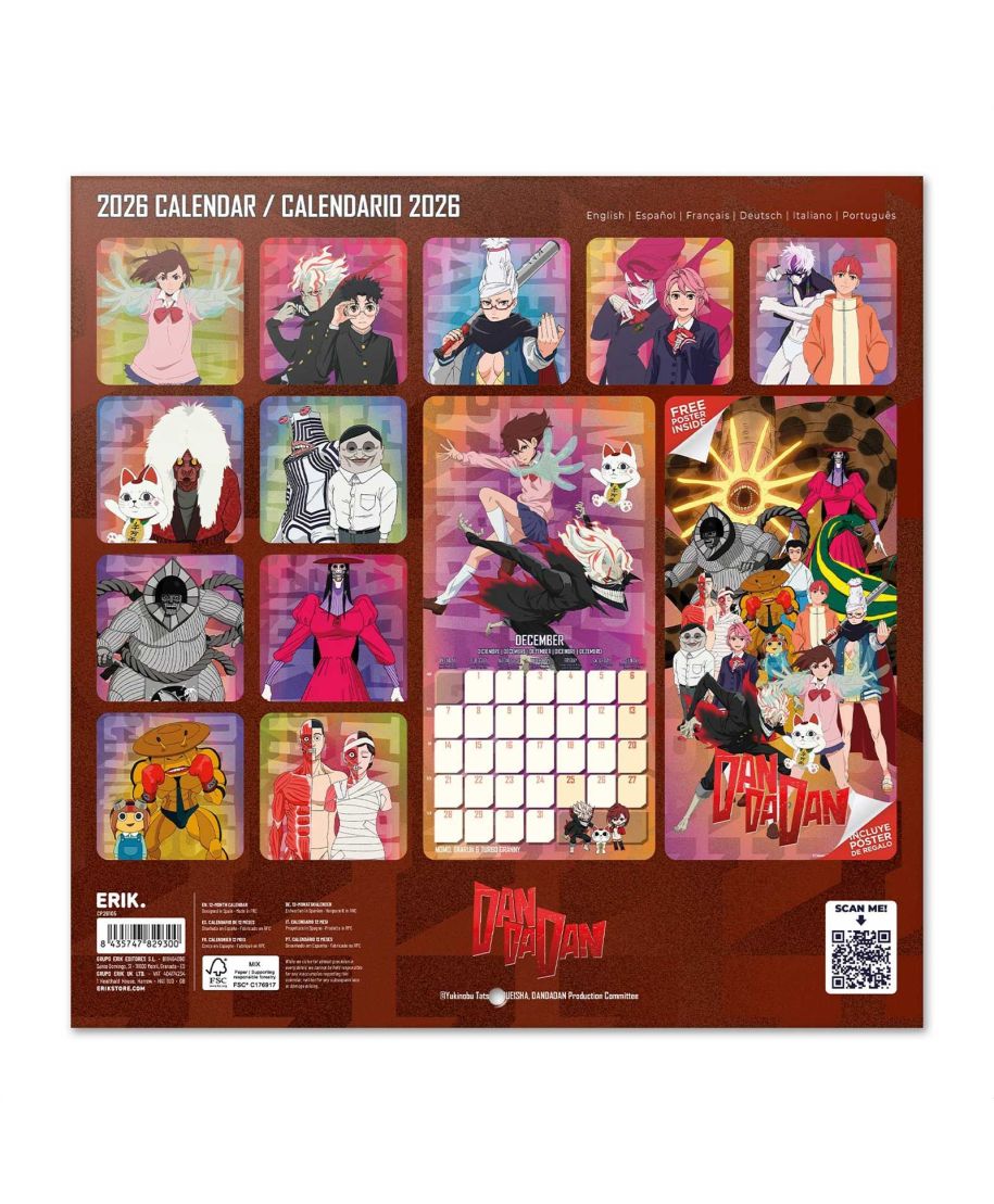Dan Da Dan oficjalny kalendarz na ścianę na 2026 rok Oryginalny i licencjonowany kalendarz, posiada 12 rozkładanych stron o wymiarach 30x60 cm. Na każdej z kart znajduje się duża fotografia oraz czytelne kalendarium z miejscem na notatki. W kalendarzu znajduje się 12 unikalnych zdjęć dla każdego miesiąca + plakat. Okładki wykonane są z papieru powlekanego matowego i laminowanego o gramaturze 250 g/m2, wnętrze z papieru powlekanego matowego o gramaturze 150 g/m2. Nagłówki są w 6 językach: angielski, hiszpański, francuski, włoski, niemiecki i portugalski. Oprawa zszywkowa. Złożony kalendarz 30x30 cm. Rozłożony kalendarz 30x60 cm. Zawiera otwór 5 mm do zawieszenia na ścianie.