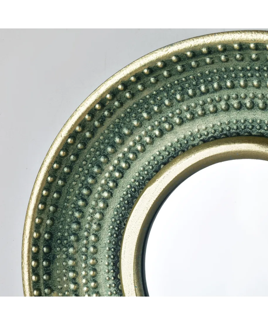 Lustro dekoracyjne DAZ to elegancki dodatek do wnętrz, utrzymany w ciepłych odcieniach złotego. Jego całkowite wymiary to 29 x 29 cm przy głębokości 3 cm, co nadaje mu lekko przestrzenną formę, idealną do powieszenia na ścianie jako samodzielny akcent lub część większej kompozycji. Centralna część to tafla lustra o średnicy 15 cm, otoczona dekoracyjną ramą, która pełni również funkcję ozdobną. Złota kolorystyka ramy dodaje całości szlachetności i sprawia, że lustro pięknie odbija światło, rozjaśniając przestrzeń i wprowadzając do niej odrobinę luksusu. Sprawdzi się zarówno w salonie, przedpokoju, jak i w sypialni, szczególnie w aranżacjach glamour, klasycznych lub boho.