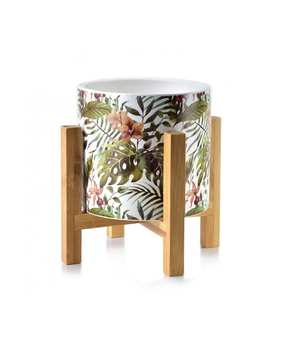 Doniczka ceramiczna - Liście - na Drewnianym stojaku - 12cm