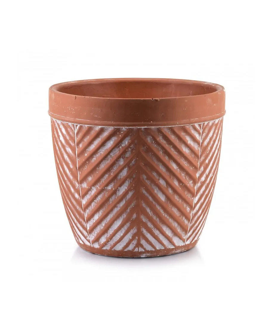 Doniczka z serii Rosita, wykonana z ceramiki w naturalnym kolorze terakoty oraz bieli.