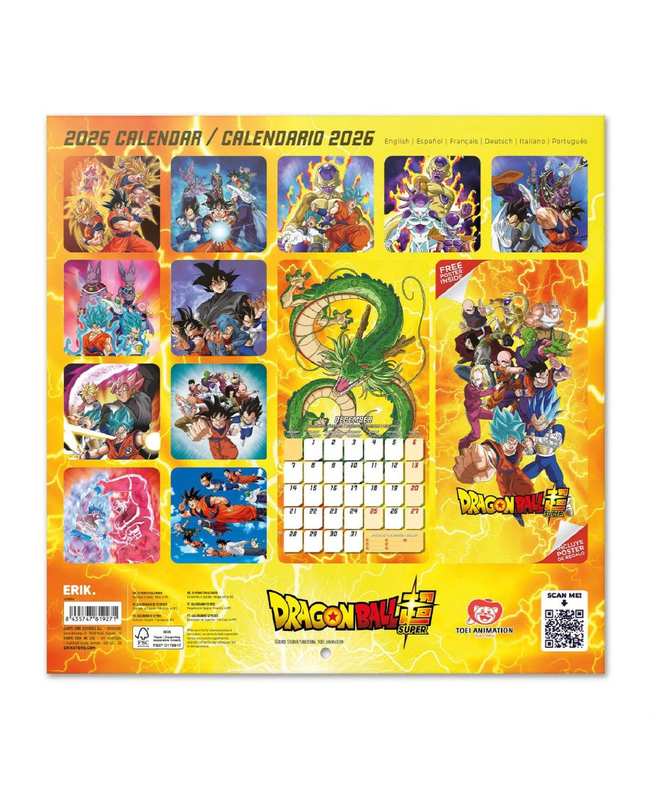 Dragon Ball oficjalny kalendarz na ścianę na 2026rok Oryginalny i licencjonowany kalendarz, posiada 12 rozkładanych stron o wymiarach 30x60 cm. Na każdej z kart znajduje się duża fotografiaoraz czytelne kalendarium z miejscem na notatki. W kalendarzu znajduje się 12 unikalnych zdjęć dla każdego miesiąca + plakat. Okładki wykonane są z papieru powlekanego matowego i laminowanego o gramaturze 250 g/m2, wnętrze z papieru powlekanego matowego o gramaturze 150 g/m2. Nagłówki są w 6 językach:angielski, hiszpański, francuski, włoski, niemiecki i portugalski. Oprawa zszywkowa. Złożony kalendarz 30x30 cm. Rozłożony kalendarz 30x60 cm. Zawiera otwór 5 mm do zawieszenia na ścianie.