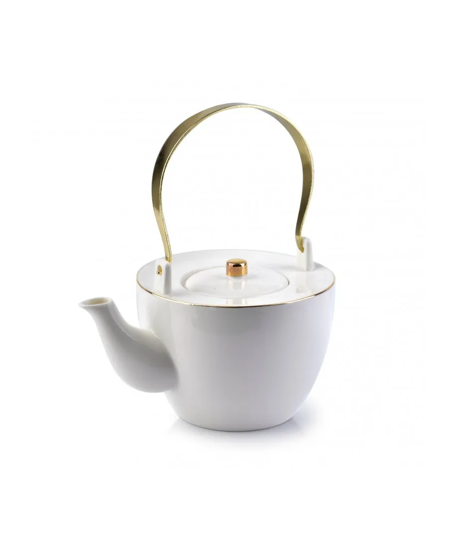 Dzbanek jest wykonany w kolorze białym, zdobiony subtelnym złotym rantem oraz pozłacanym uchwytem.