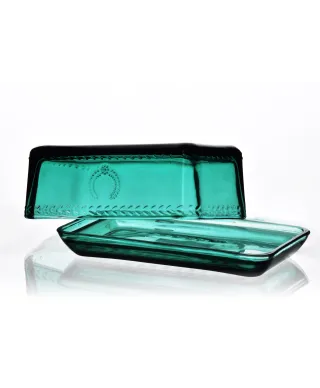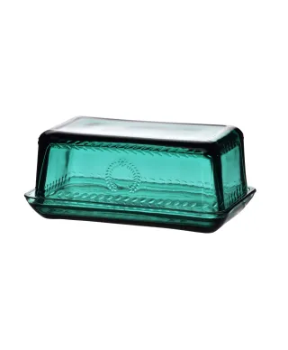 Szklana maselnica z serii ECILA DARK w odcieniu ciemnej zieleni z ozdobnym\tłoczeniem!\Można używać w zmywarce.\\17x9,7xh7,5cm\opakowanie jednostkowe brązowy kartonik: 17x10xh9cm