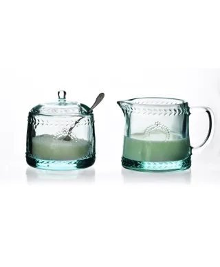 Przepiękny szklany komplet w odcieniu lekkiego turkusu z tłoczeniem ozdobnym! Komplet cukiernicy z mlecznikiem idealnie wpasuje się do kązdego wnętrza, jadalni salonu, kuchni.\Wykonany ze szkła sodowego, nadaje się do zmywarki, nie nalęzy używać w mikrofali..\\cukiernica śr 9xh7,3cm\wysokość z pokrywką 10,5cm\\mlecznik 300ml\12,5x8xh8,7cm\\opakowanie:20x10xh10cm